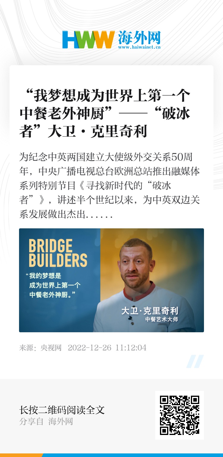 为纪念中英两国建立大使级外交关系50周年,中央广播电视总台欧洲总站推出融媒体系列特别节目《寻找新时代的“破冰者”》,讲述半个世纪以来,为中英双边关系发展做出杰出贡献的人物故事。本期推出的是英国利物浦市中餐艺术大师大卫·克里奇利的故事。