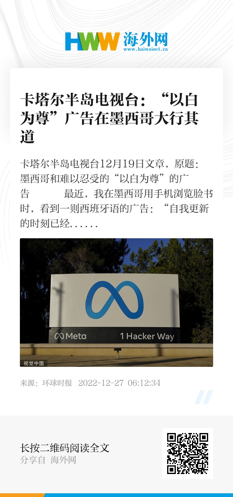 卡塔尔半岛电视台12月19日文章,原题:墨西哥和难以忍受的“以白为尊”的广告 最近,我在墨西哥用手机浏览脸书时,看到一则西班牙语的广告:“自我更新的时刻已经到来。”一家位于墨西哥北部新莱昂州的公司提供超过1.2万美元的贷款,用于人们选定的整容手术。一张身穿比基尼、金发碧眼的白人女子的照片令人跃跃欲试。