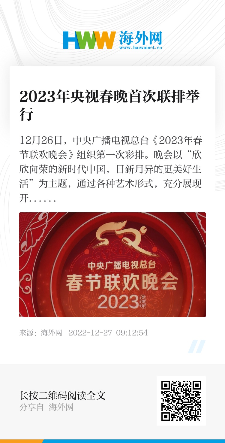 12月26日,中央广播电视总台《2023年春节联欢晚会》组织第一次彩排。晚会以“欣欣向荣的新时代中国,日新月异的更美好生活”为主题,通过各种艺术形式,充分展现开心信心、顽强奋进的主旋律。彩排在节目多样态呈现和各类技术手段的配合上取得初步成效。图片作者:CCTV+/视觉中国