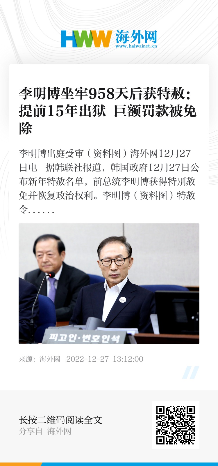 海外网12月27日电 据韩联社报道,韩国政府12月27日公布新年特赦名单,前总统李明博获得特别赦免并恢复政治权利。