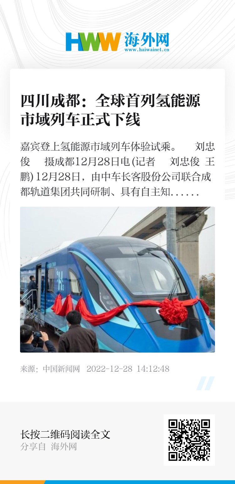 中新网成都12月28日电 (记者 刘忠俊 王鹏)12月28日,由中车长客股份公司联合成都轨道集团共同研制、具有自主知识产权的全球首列氢能源市域列车在四川成都正式下线,车辆采用“复兴号”关键核心技术,四辆编组,最高时速160公里,内置“氢能动力”系统,可实现600公里超长续航。