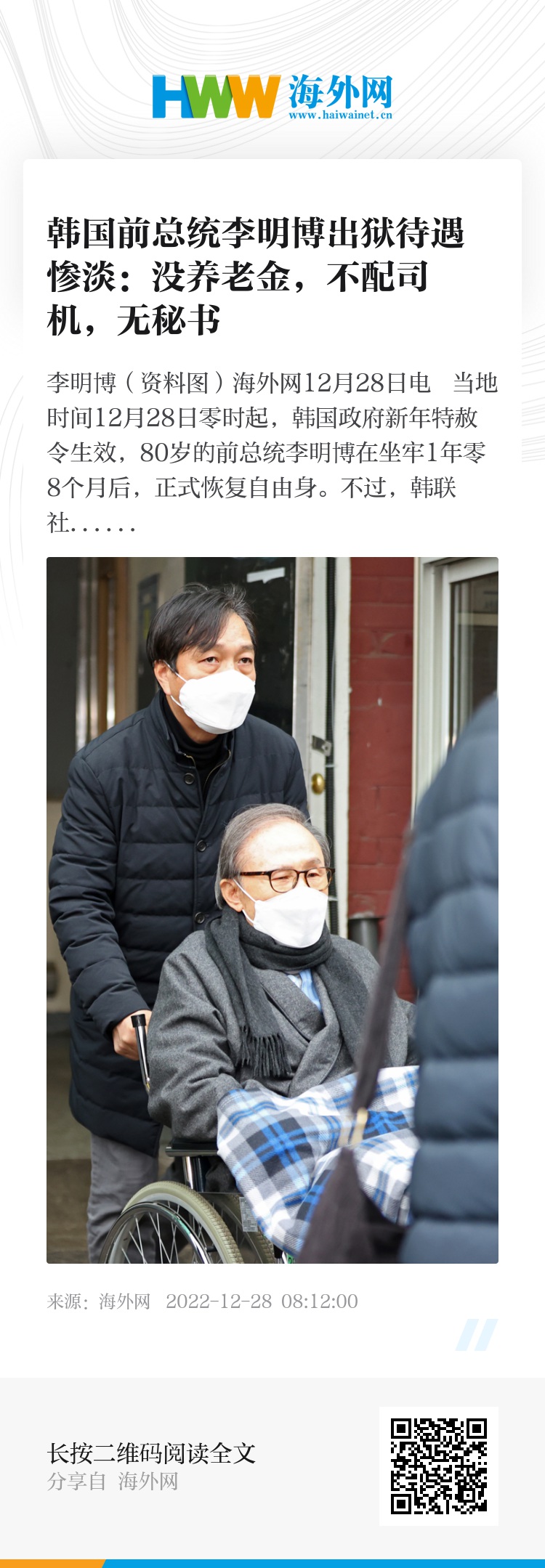 海外网12月28日电 当地时间12月28日零时起,韩国政府新年特赦令生效,80岁的前总统李明博在坐牢1年零8个月后,正式恢复自由身。不过,韩联社称,李明博因曾被判监禁,大部分前总统待遇被剥夺,只能享受警卫服务。