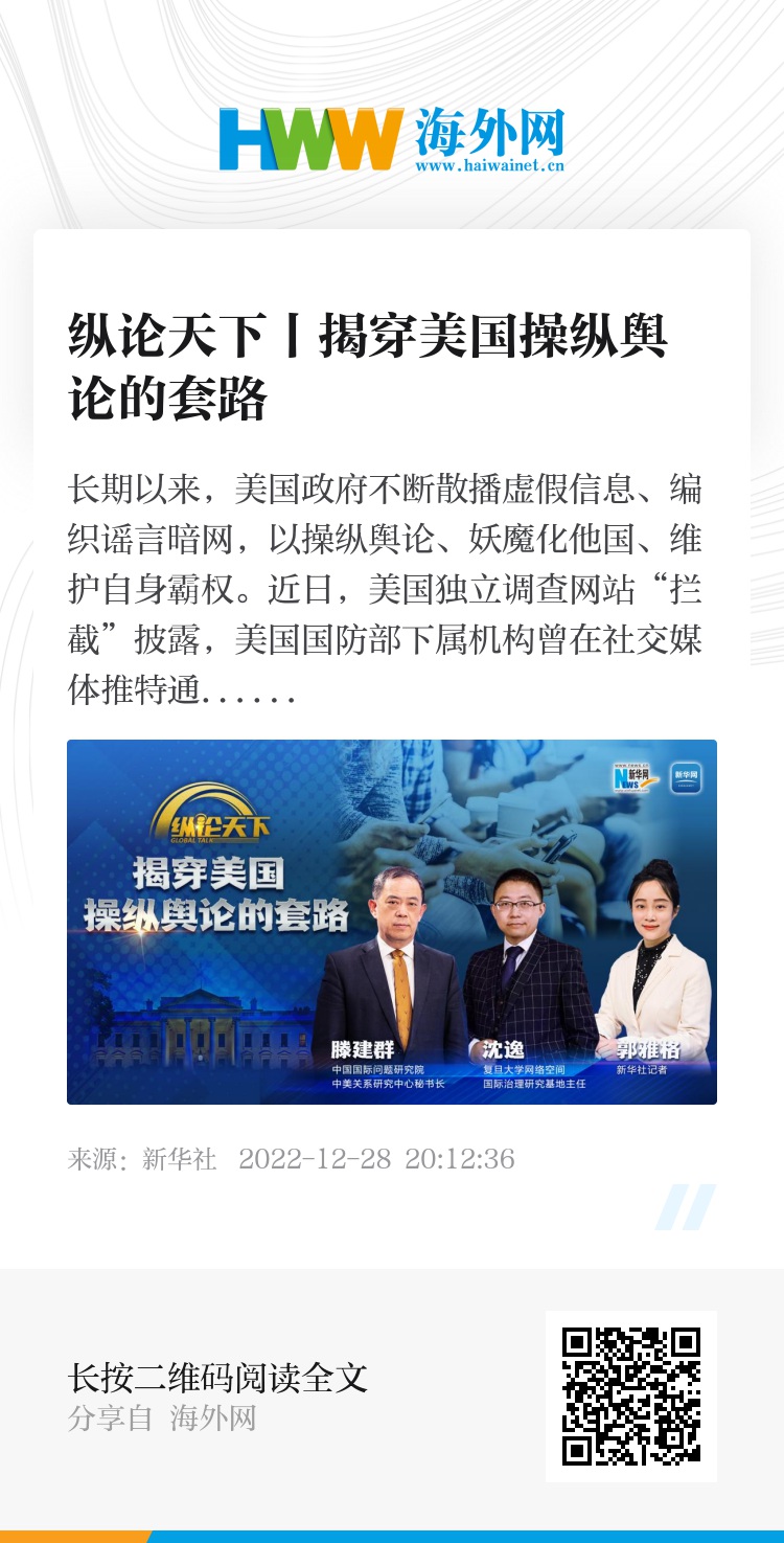 新华社记者 郭雅格:新华网的网友们,大家好,欢迎来到《纵论天下》。今天我们非常荣幸地邀请到中国国际问题研究院研究员、中美关系研究中心秘书长滕建群,也将远程连线复旦大学教授、网络空间国际治理研究基地主任沈逸,同我们一道揭穿美国操纵舆论的真相。