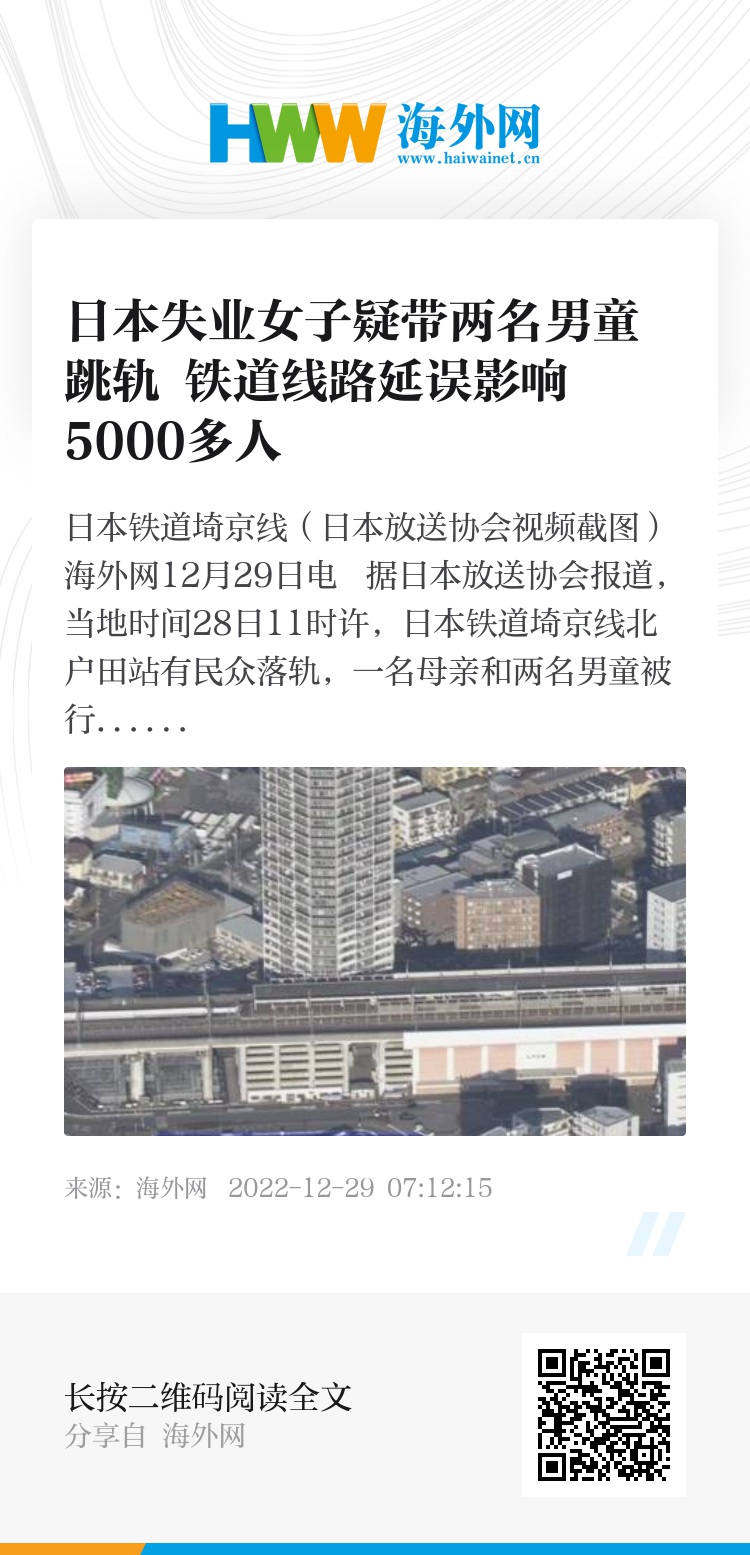 海外网12月29日电 据日本放送协会报道,当地时间28日11时许,日本铁道埼京线北户田站有民众落轨,一名母亲和两名男童被行驶的电车撞击后丧生,事件导致铁道线路延误。