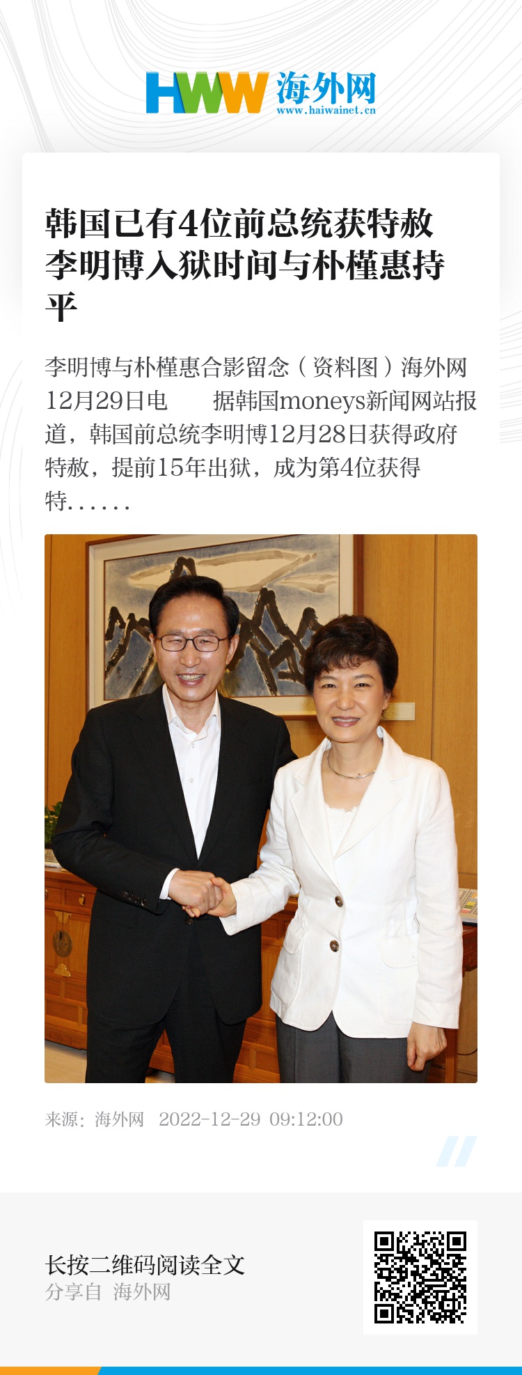 海外网12月29日电 据韩国moneys新闻网站报道,韩国前总统李明博12月28日获得政府特赦,提前15年出狱,成为第4位获得特赦的前总统。