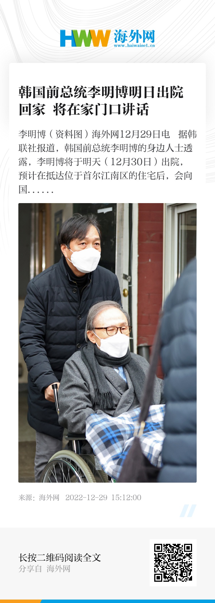 海外网12月29日电 据韩联社报道,韩国前总统李明博的身边人士透露,李明博将于明天(12月30日)出院,预计在抵达位于首尔江南区的住宅后,会向国民发表讲话。