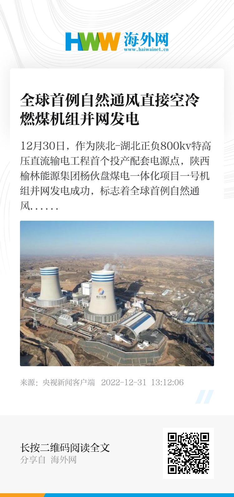 12月30日,作为陕北-湖北正负800kv特高压直流输电工程首个投产配套电源点,陕西榆林能源集团杨伙盘煤电一体化项目一号机组并网发电成功,标志着全球首例自然通风直接空冷系统(NDC)660兆瓦燃煤机组正式进入带负荷试运阶段。