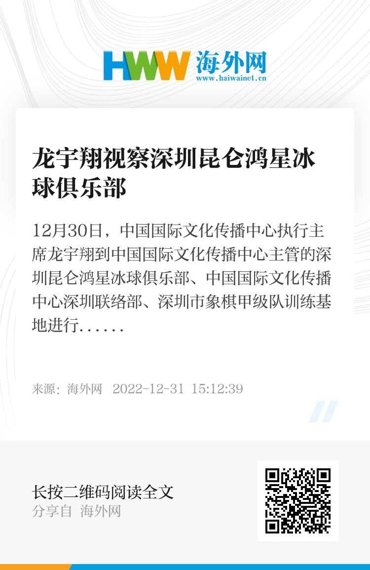 龙宇翔先后在深圳昆仑鸿星俱乐部、深圳联络部、深圳市象棋甲级队训练基地听取了负责人的汇报。他表示,参与体育运动能增强体质、锤炼心志、健全人格,有助于个人的全面发展。冰球是冬季运动的主要项目,运动员们在冰场上顽强拼搏,尽情展示新时代冰球运动员奋发有为的精神风貌;象棋是群众基础深厚的智力运动,棋手们在方寸之间展开智力的巅峰对决。象棋与冰球,分别象征脑力与体魄,双头并进,文武并重。中国国际文化传播中心主管的昆仑鸿星冰球俱乐部自2016年成立以来,一直坚韧努力、厉兵秣马,从五棵松体育馆到上海三林冰上中心,从深圳大运中心到莫斯科大区的梅季奇体育馆,男子冰球队逐渐站稳在世界顶级职业联赛的行列,女子冰球队成为世界职业赛场难觅敌手的劲旅,为中国冰球运动的持续稳步发展奠定坚实基础。我们相信定能看到中国女冰再次在明年深圳举办的女子冰球世锦赛上大放异彩。深圳是一个全民健身氛围浓厚的城市,这离不开各级领导的重视与支持。建立深圳市象棋甲级队训练基地,加大力度开展以象棋为代表的智力运动赛事,全力支持青少年接触冰球运动,为国家冰球培育青少年后备军,都将更全面地满足人民日益增长的精神需求与体育需求,为广大民众,尤其是青少年享受体育乐趣和理解竞技精神,为加快建设体育强国、健康中国贡献更多力量。最后,龙宇翔进一步勉励中国国际文化传播中心深圳联络部,立足深圳、沟通港澳,全力配合深圳市委市政府,做好深圳文化体育与对外联络、对外宣传工作。