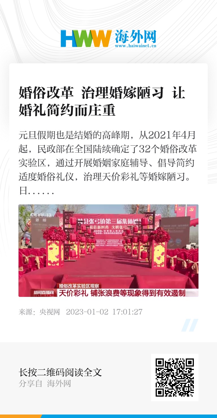 民政部介绍,婚俗改革实验区开展以来,大部分实验区天价彩礼、铺张浪费现象得到有效遏制,有的地方婚礼费用减少了百分之九十以上。在河北省河间市,以前当地农村结婚彩礼花费平均在二十万元左右,人情攀比、大操大办、铺张浪费等不良婚俗现象给很多家庭带来沉重负担。为推进婚俗改革落地见效,河间市将婚俗改革规章制度写入《村规民约》和《居民公约》,自2021年以来,河间市结婚登记的新人中零彩礼、低彩礼占到90%以上。