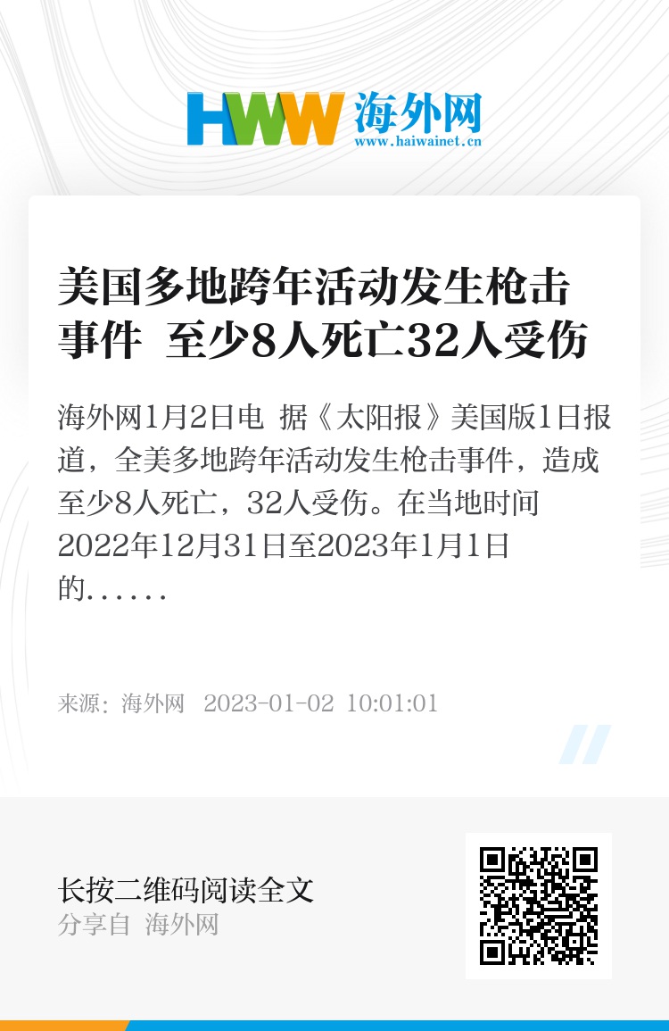 海外网1月2日电 据《太阳报》美国版1日报道,全美多地跨年活动发生枪击事件,造成至少8人死亡,32人受伤。