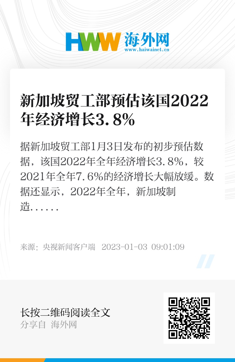 据新加坡贸工部1月3日发布的初步预估数据,该国2022年全年经济增长3.8%,较2021年全年7.6%的经济增长大幅放缓。