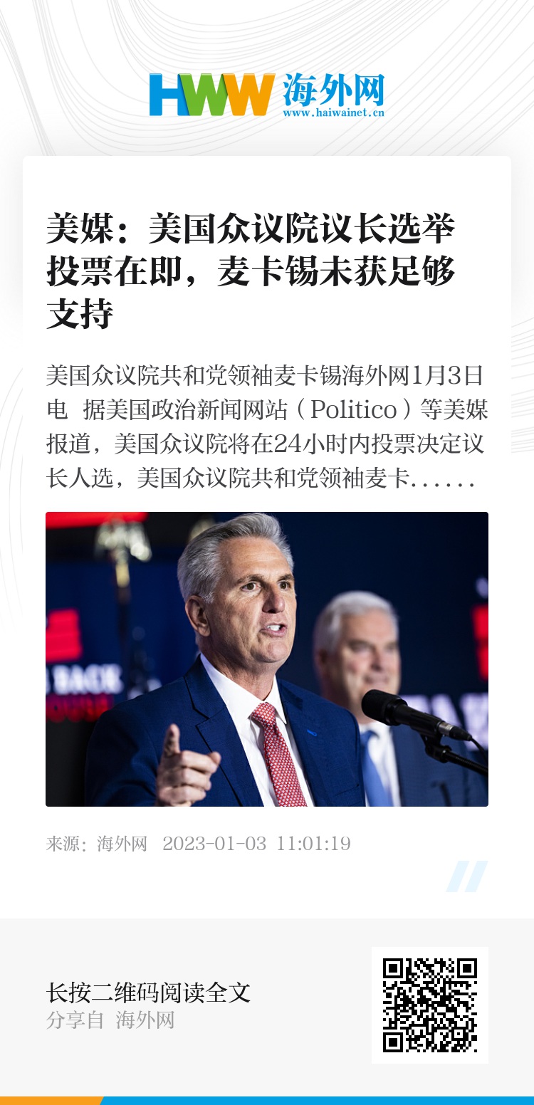 海外网1月3日电 据美国政治新闻网站(Politico)等美媒报道,美国众议院将在24小时内投票决定议长人选,美国众议院共和党领袖麦卡锡仍未获足够支持。