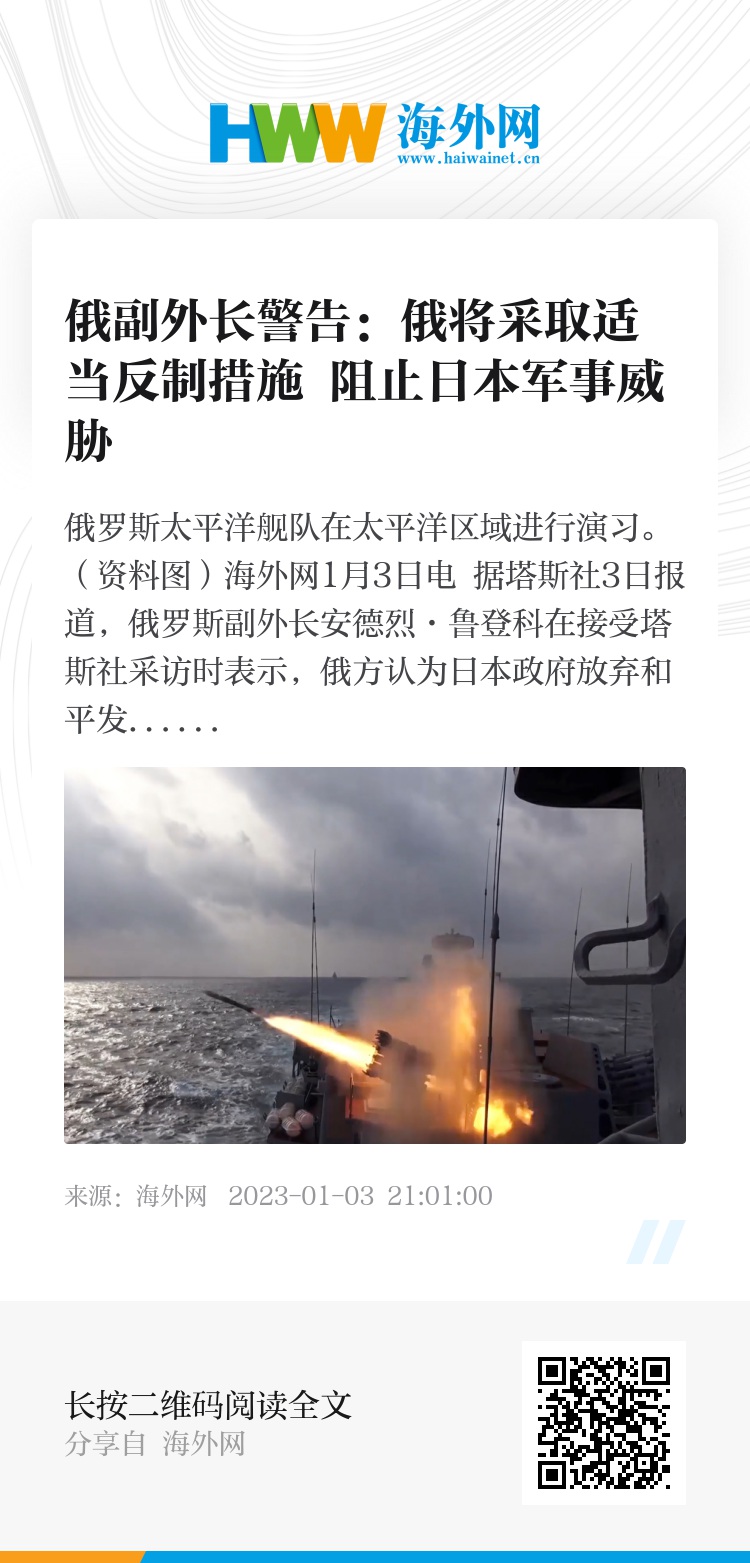 海外网1月3日电 据塔斯社3日报道,俄罗斯副外长安德烈·鲁登科在接受塔斯社采访时表示,俄方认为日本政府放弃和平发展的政策是对俄罗斯和整个亚太地区安全的严重挑战,并警告说,俄罗斯除了采取适当的反制措施阻止日方军事威胁之外,已别无选择。
