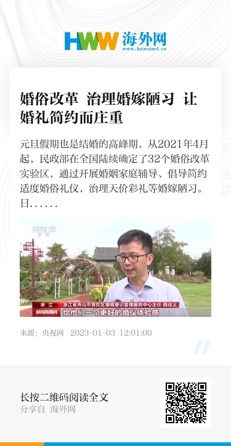 民政部社会事务司司长 王金华:为了治理“天价彩礼”,一些地方在婚俗改革实验过程当中,向社会发出了“低彩礼”和“零彩礼”的倡议,发挥村民自治组织作用,把抵制高价彩礼、大操大办纳入村规民约,引导婚姻当事人不要把婚姻关系物化为一种以彩礼多少为标准的买卖关系,而是以志趣、志向、共同的理想作为婚姻的基础。