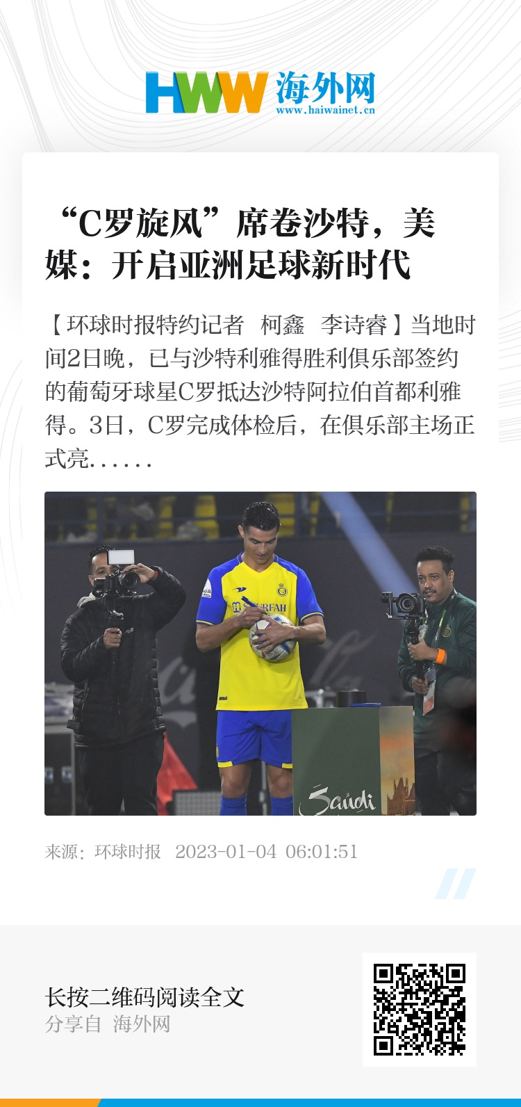 【环球时报特约记者 柯鑫 李诗睿】当地时间2日晚,已与沙特利雅得胜利俱乐部签约的葡萄牙球星C罗抵达沙特阿拉伯首都利雅得。3日,C罗完成体检后,在俱乐部主场正式亮相。美联社评论称,C罗的到来开启亚洲足球新时代。