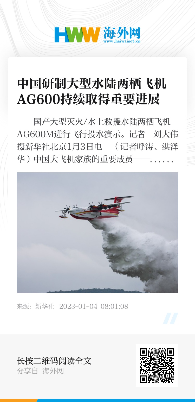 新华社北京1月3日电 (记者呼涛、洪泽华)中国大飞机家族的重要成员——大型水陆两栖飞机“鲲龙”AG600飞机研制工作和市场化进程在2022年取得重大进展。