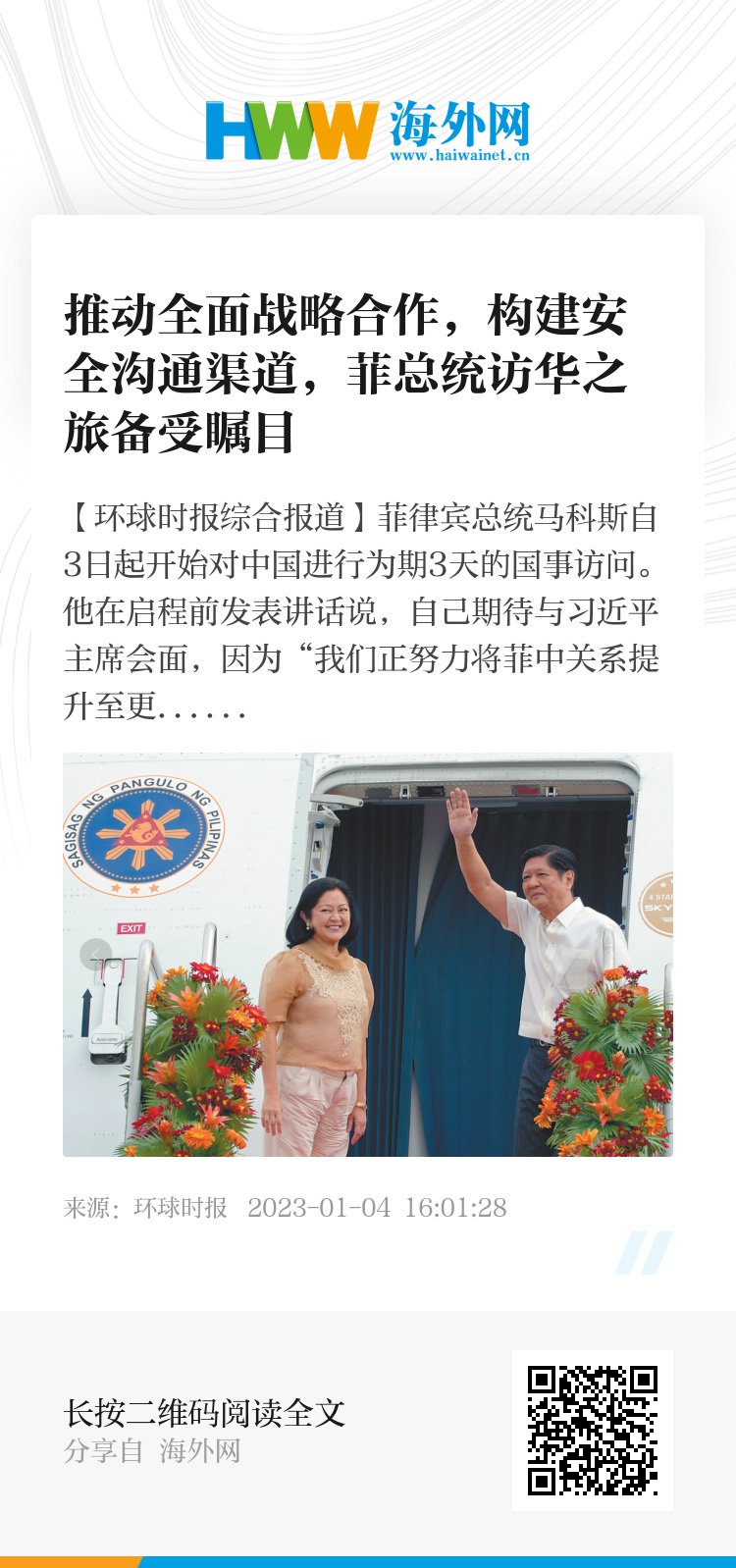 【环球时报综合报道】菲律宾总统马科斯自3日起开始对中国进行为期3天的国事访问。他在启程前发表讲话说,自己期待与习近平主席会面,因为“我们正努力将菲中关系提升至更高档位,这有望为两国人民带来大量和平与发展的机会”。菲律宾媒体3日报道称,这是马科斯新年伊始的首个外访行程,也是其任内首次访华以及首次正式访问东盟以外国家。同时,他还成为2023年中方接待的首位外国元首。这充分体现出两国政府对双方关系的高度重视,预计将为菲中未来一段时间的双边关系定调。不少菲媒在报道中提到,菲政府和企业期待马科斯此次国事访问能够促进与中国的更多合作,加强贸易与投资往来。不过,部分西方舆论却只将目光锁定在南海问题上,大肆炒作“争议海域的紧张局势”。马科斯3日在讲话中表示,我们两国之间的问题,是菲律宾和中国这样的朋友之间不应存在的问题,“我们将努力为两国的共同利益解决这些问题”。