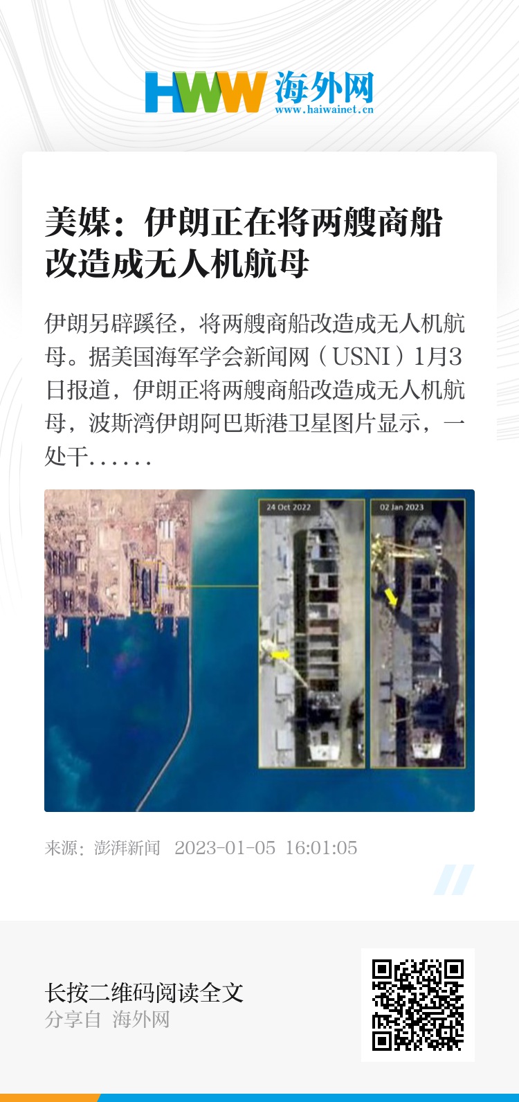 据美国海军学会新闻网(USNI)1月3日报道,伊朗正将两艘商船改造成无人机航母,波斯湾伊朗阿巴斯港卫星图片显示,一处干船坞内的一艘商用集装箱船正在被改造成无人机航母,可用于搭载直升机和固定翼无人机。