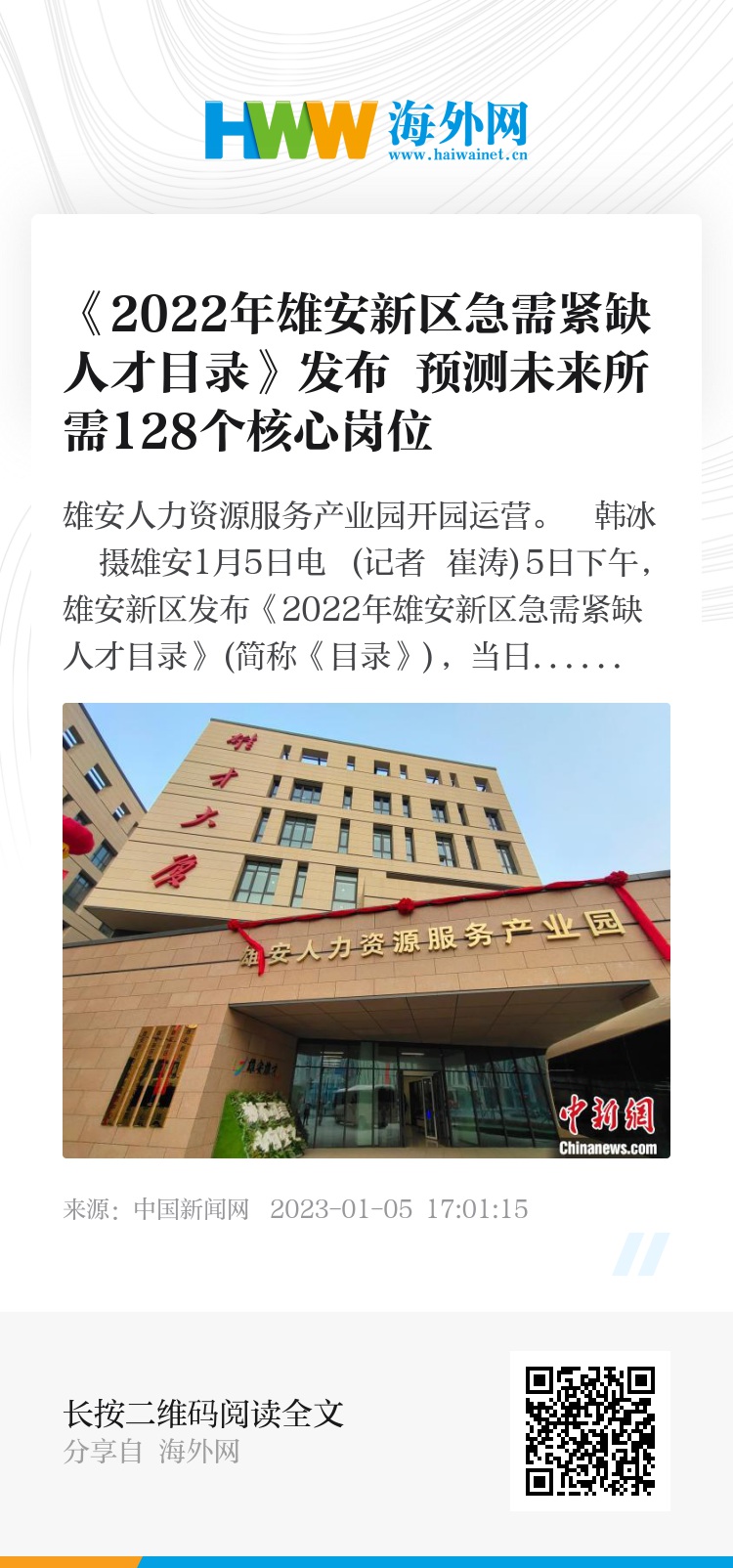 中新网雄安1月5日电 (记者 崔涛)5日下午,雄安新区发布《2022年雄安新区急需紧缺人才目录》(简称《目录》),当日,雄安人力资源服务产业园同步开园运营。