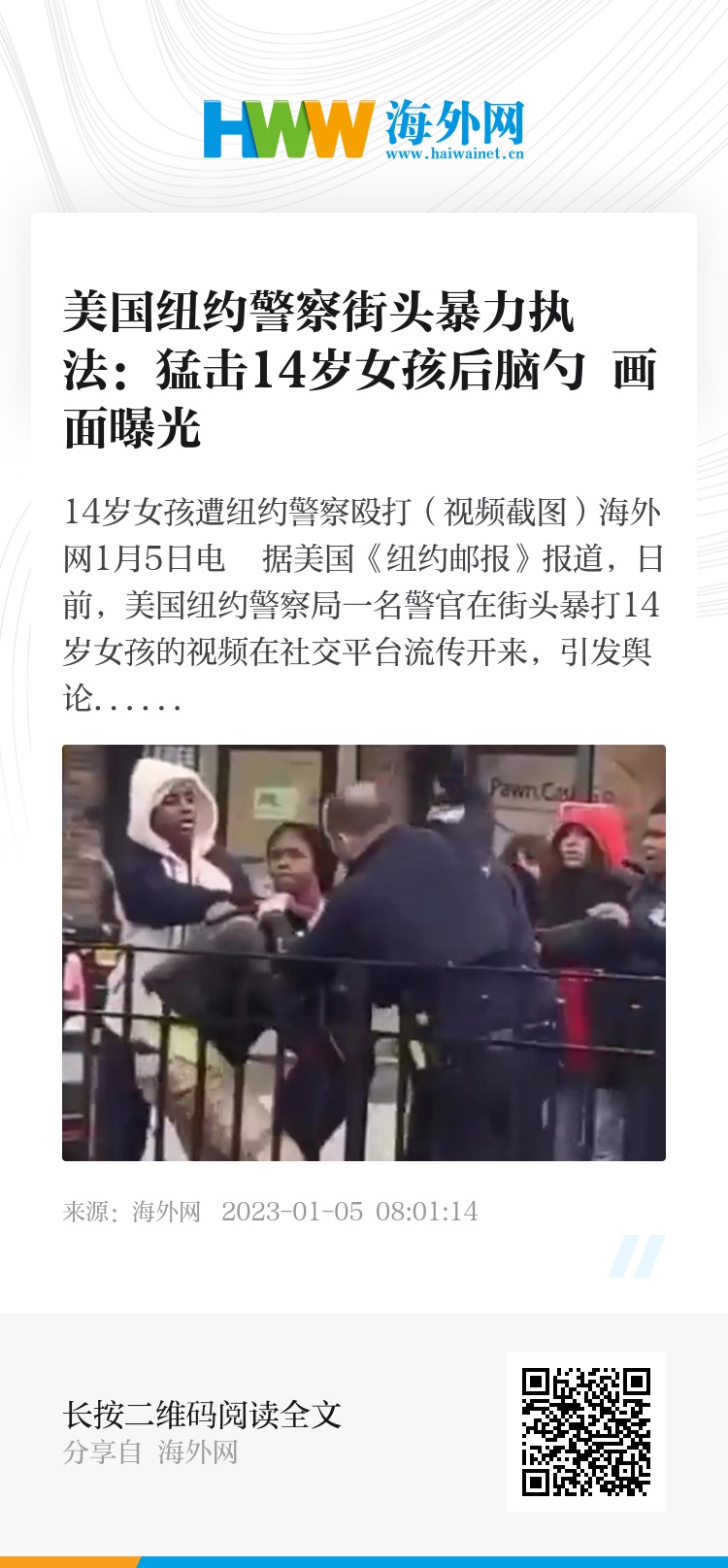 海外网1月5日电 据美国《纽约邮报》报道,日前,美国纽约警察局一名警官在街头暴打14岁女孩的视频在社交平台流传开来,引发舆论哗然。目前,该警官已被停职。