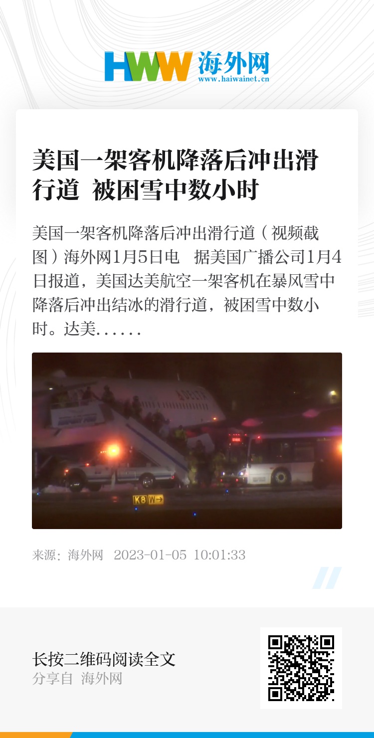 海外网1月5日电 据美国广播公司1月4日报道,美国达美航空一架客机在暴风雪中降落后冲出结冰的滑行道,被困雪中数小时。