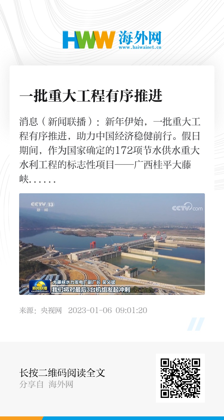 央视网消息(新闻联播):新年伊始,一批重大工程有序推进,助力中国经济稳健前行。