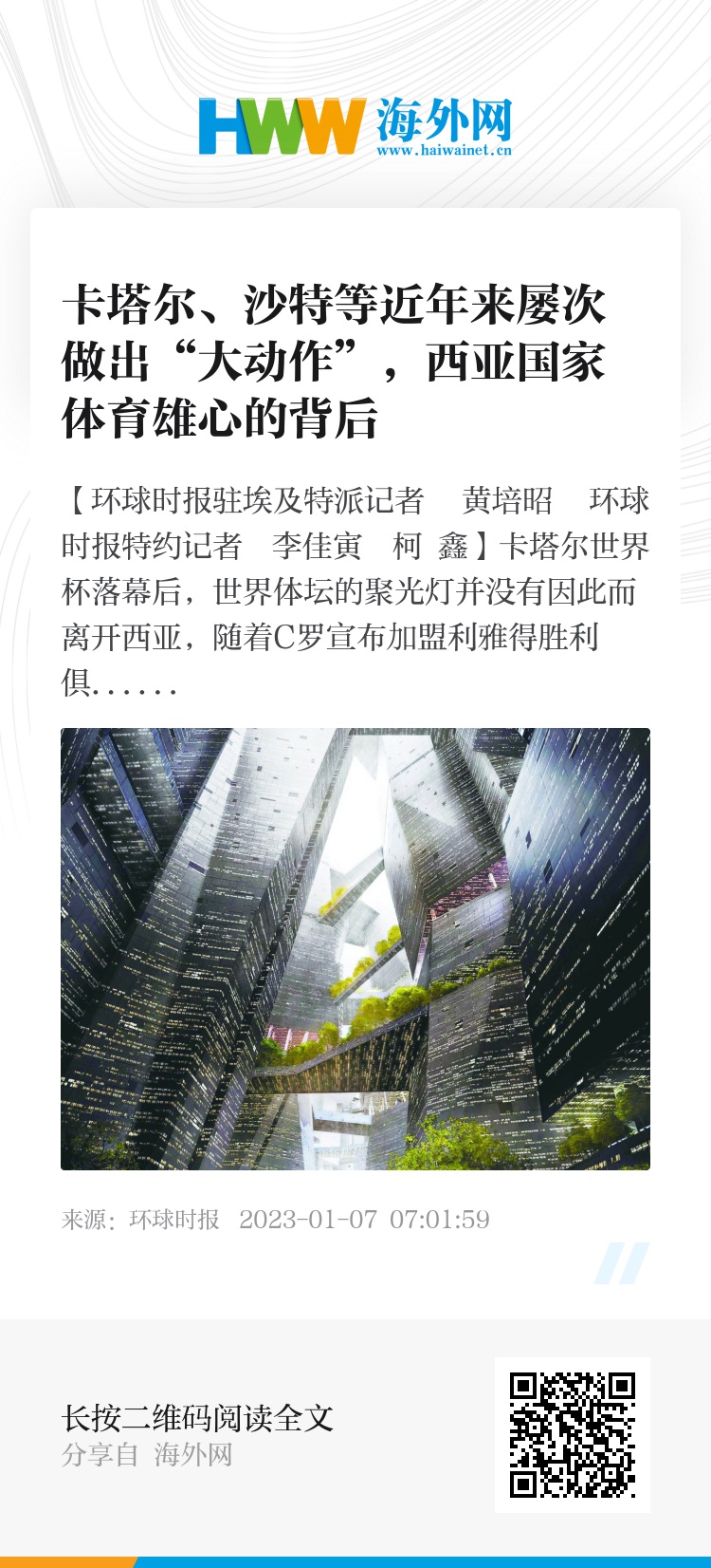 【环球时报驻埃及特派记者 黄培昭 环球时报特约记者 李佳寅 柯 鑫】卡塔尔世界杯落幕后,世界体坛的聚光灯并没有因此而离开西亚,随着C罗宣布加盟利雅得胜利俱乐部,越来越多的人开始关注并了解西亚足球。其实除了足球领域,卡塔尔、沙特等西亚国家近年来在体育方面屡次做出“大动作”:两个月前,沙特成为首个获得亚洲冬季运动会举办权的西亚国家;去年,沙特王储公布游戏与电子竞技国家战略;卡塔尔还拿下2025乒乓球世锦赛的主办权……这些无不彰显西亚国家的体育雄心,其背后则是西亚国家为塑造国家形象、提升国际声誉所做出的努力。