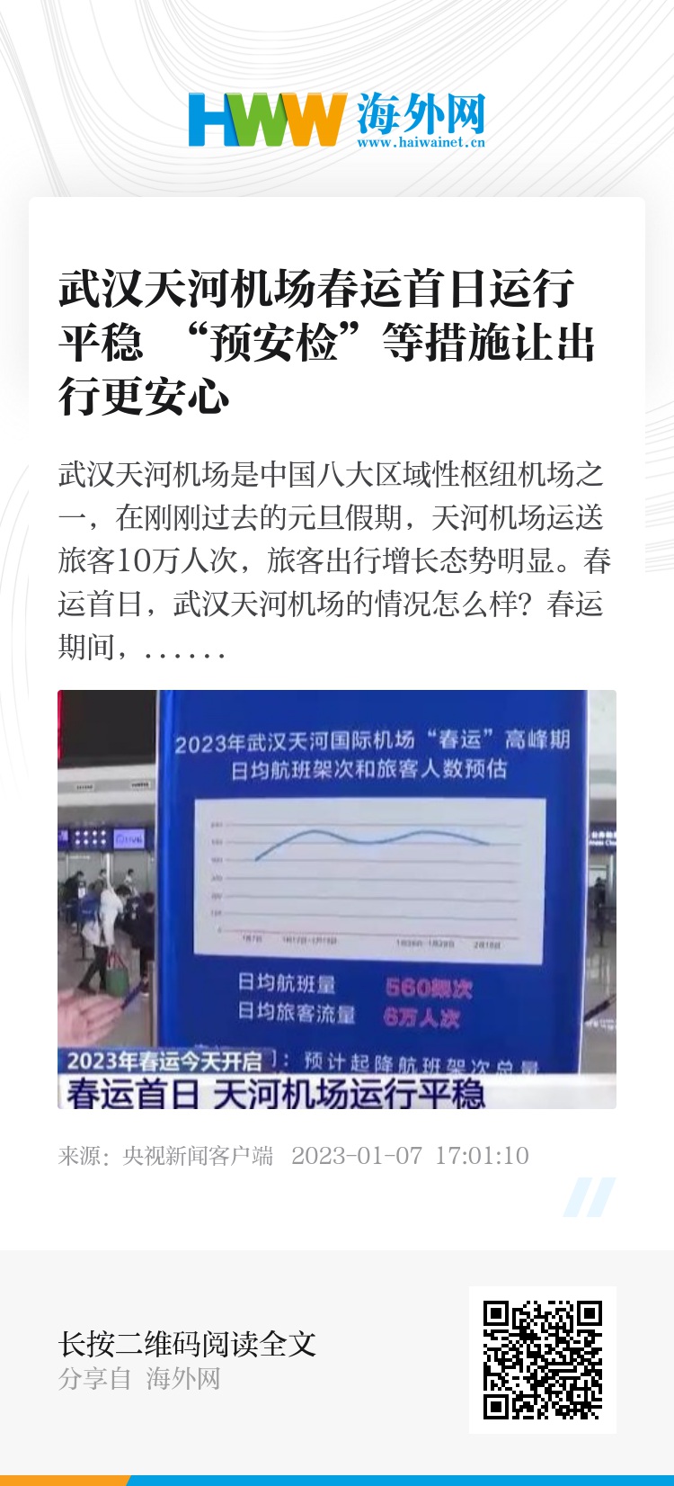 总台记者 倪晶依:我现在是在武汉天河机场航站楼,目前有不少旅客大包小包,行色匆匆,马上就要踏上旅程。今天(1月7日)是春运第一天,机场整体的运行还是比较平稳的,并没有出现十分拥挤的场面。机场方面预测,今天整个天河机场将有约400架次航班起落,将运送旅客约4.5万人,这个数字与前两天相比,略有增长。