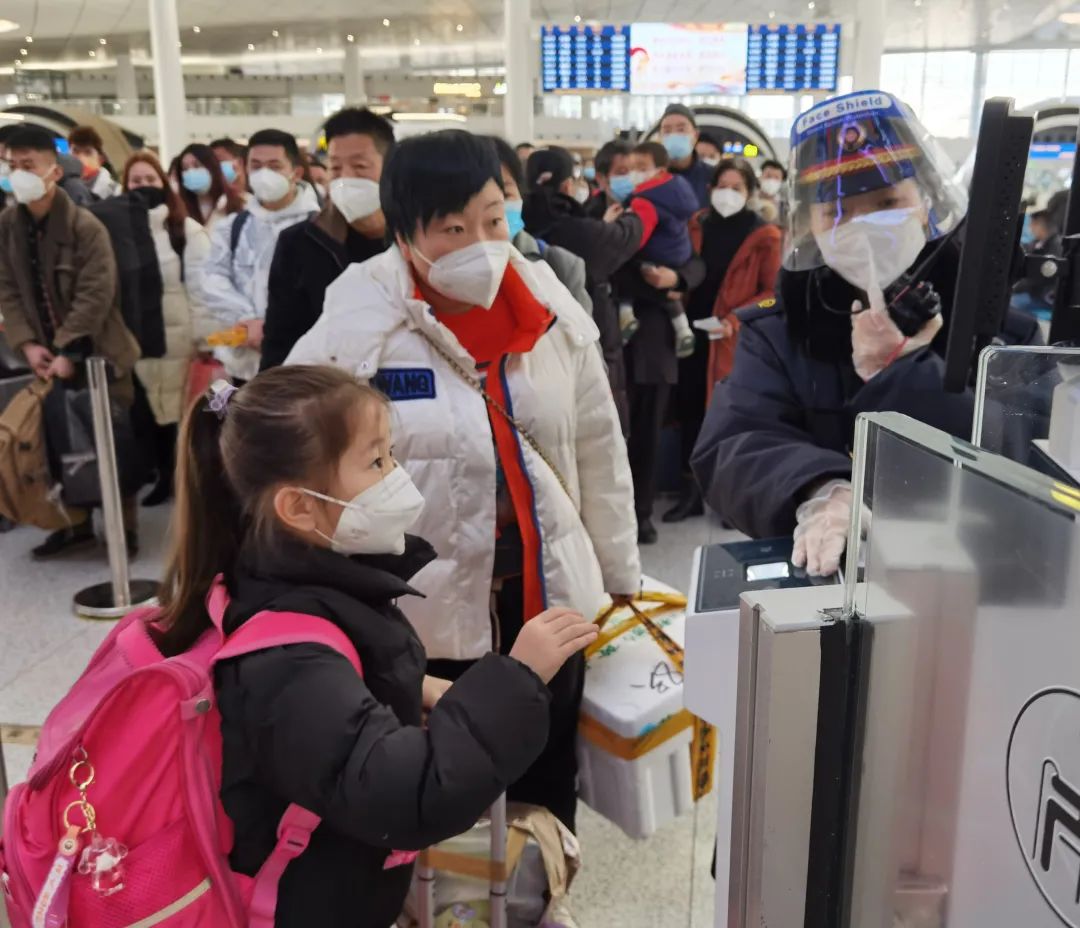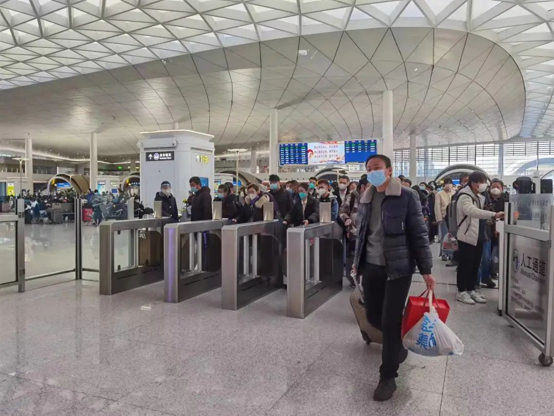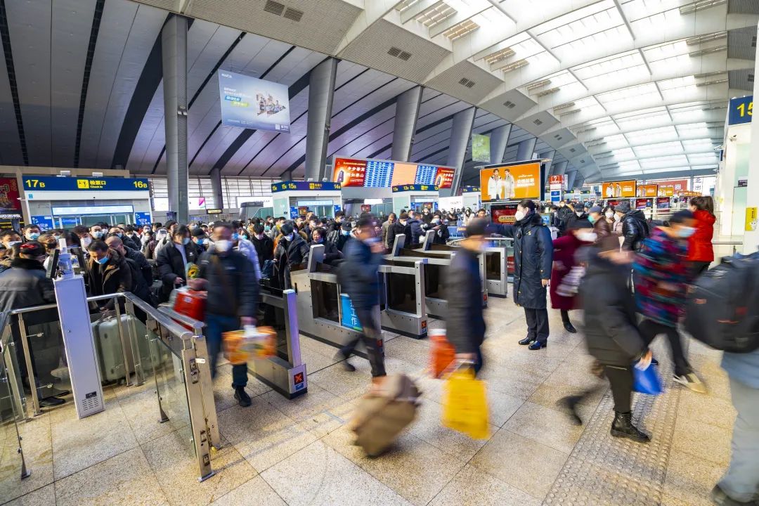 7时左右,天刚蒙蒙亮,北京南站灯火通明、人头攒动,旅客们拉着大大小小的行李箱、拎着五颜六色的礼品袋,有序经过安检通道走进候车大厅。