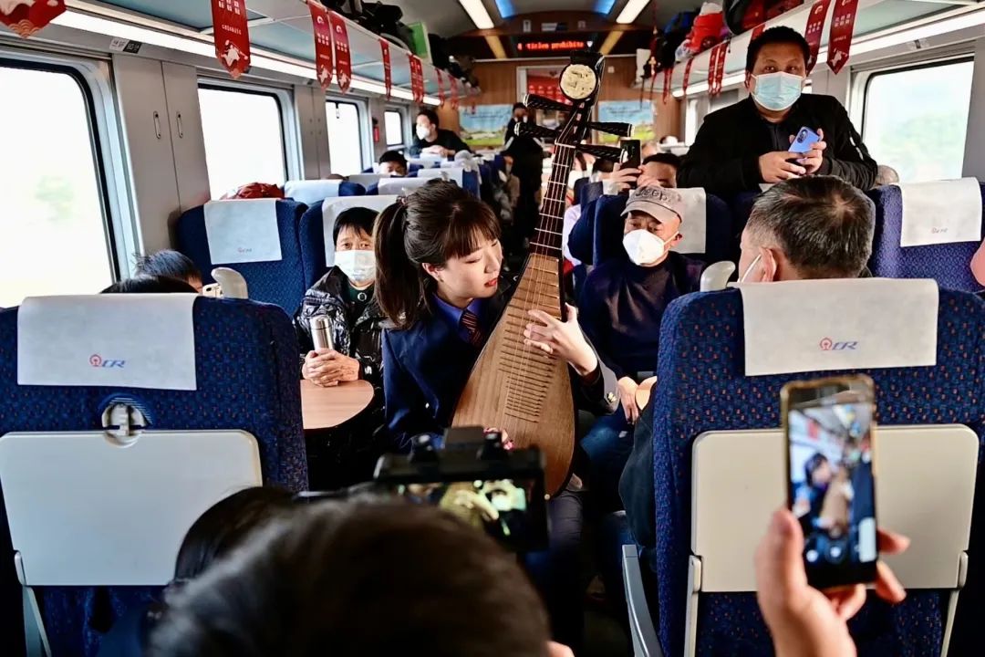 C43次列车开出后不久,鑫鑫很快被一阵琵琶声吸引,旅客们围观了起来。成都客运段列车员不仅提前把车厢布置得焕然一新,还准备了几个小节目为旅客的旅途增添乐趣。