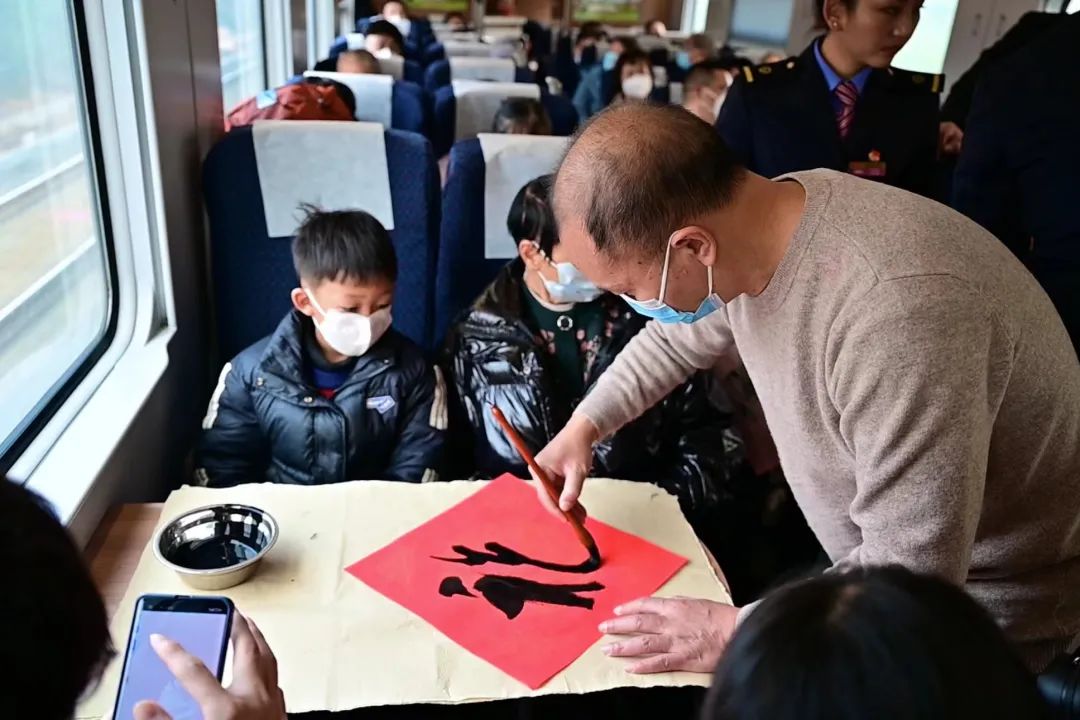 座无虚席的车厢里氛围轻松、欢快,行李架上挤满了腊肠、水果各种年货,贴着窗花的车窗映照出旅客们喜气洋洋的脸庞。