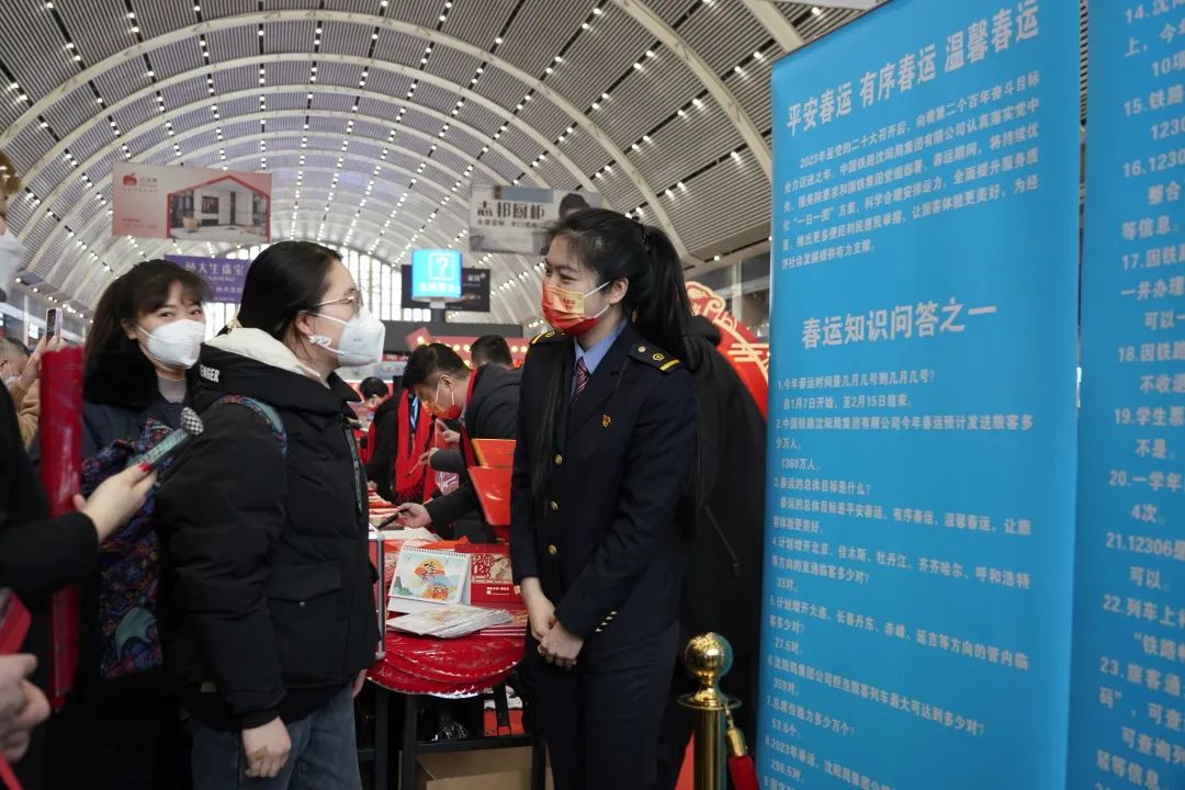 1月7日,正值2023年春运首日。7时30分许,中国铁路沈阳局集团有限公司沈阳站候车大厅内格外热闹,不少旅客在有奖竞答的展板前与客运职工开心互动,开动脑筋,争相竞猜。