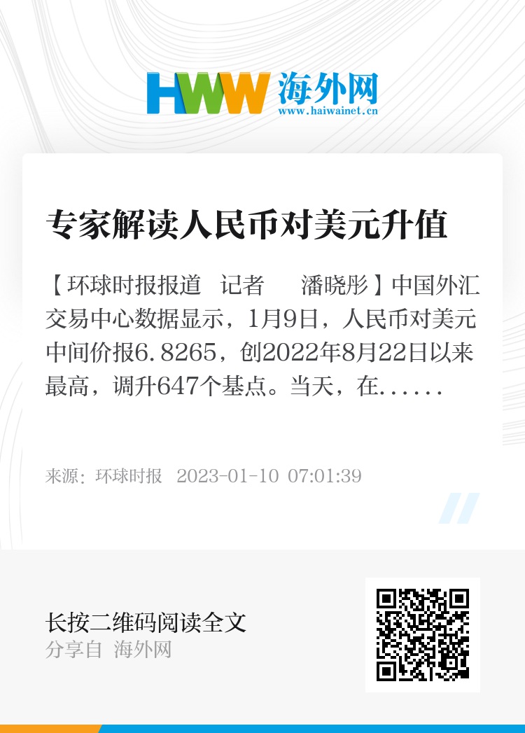 【环球时报报道 记者 潘晓彤】中国外汇交易中心数据显示,1月9日,人民币对美元中间价报6.8265,创2022年8月22日以来最高,调升647个基点。当天,在岸、离岸人民币盘中对美元突破6.8关口,是自2022年8月以来首次。
