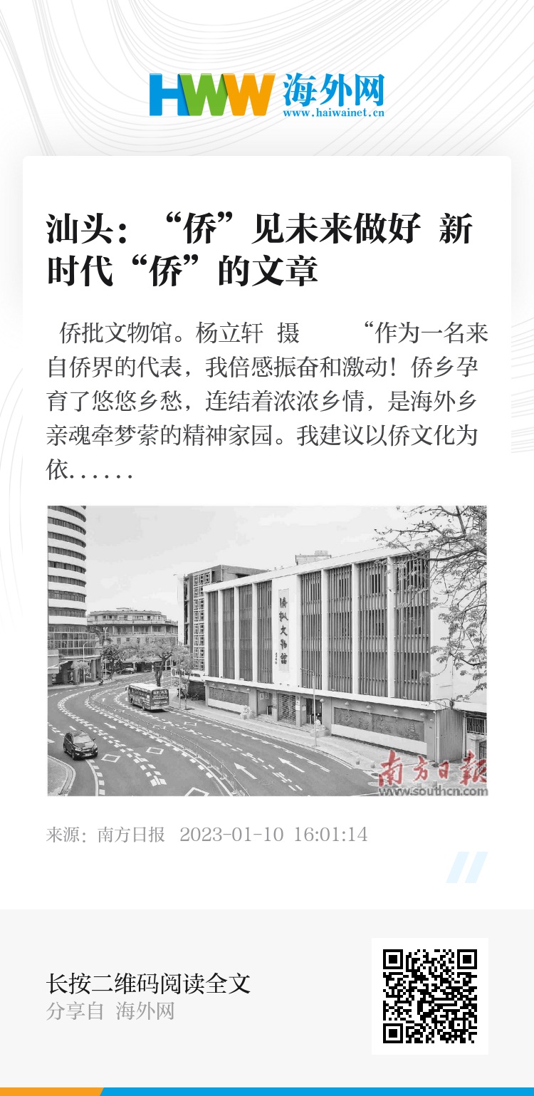 “作为一名来自侨界的代表,我倍感振奋和激动!侨乡孕育了悠悠乡愁,连结着浓浓乡情,是海外乡亲魂牵梦萦的精神家园。我建议以侨文化为依托,以民族情感为纽带,把汕头的侨乡优势转化为发展优势,做实做优做强侨乡品牌,打造聚侨惠民的和美侨乡。”汕头市人大代表、汕头市侨界青年联合会监事长沈雪山在接受记者采访时说。2023年汕头市政府工作报告对“凝心聚力做好‘侨’的文章”着墨较多,传递了各界合力推动新一年引侨聚侨惠侨工作的心声。