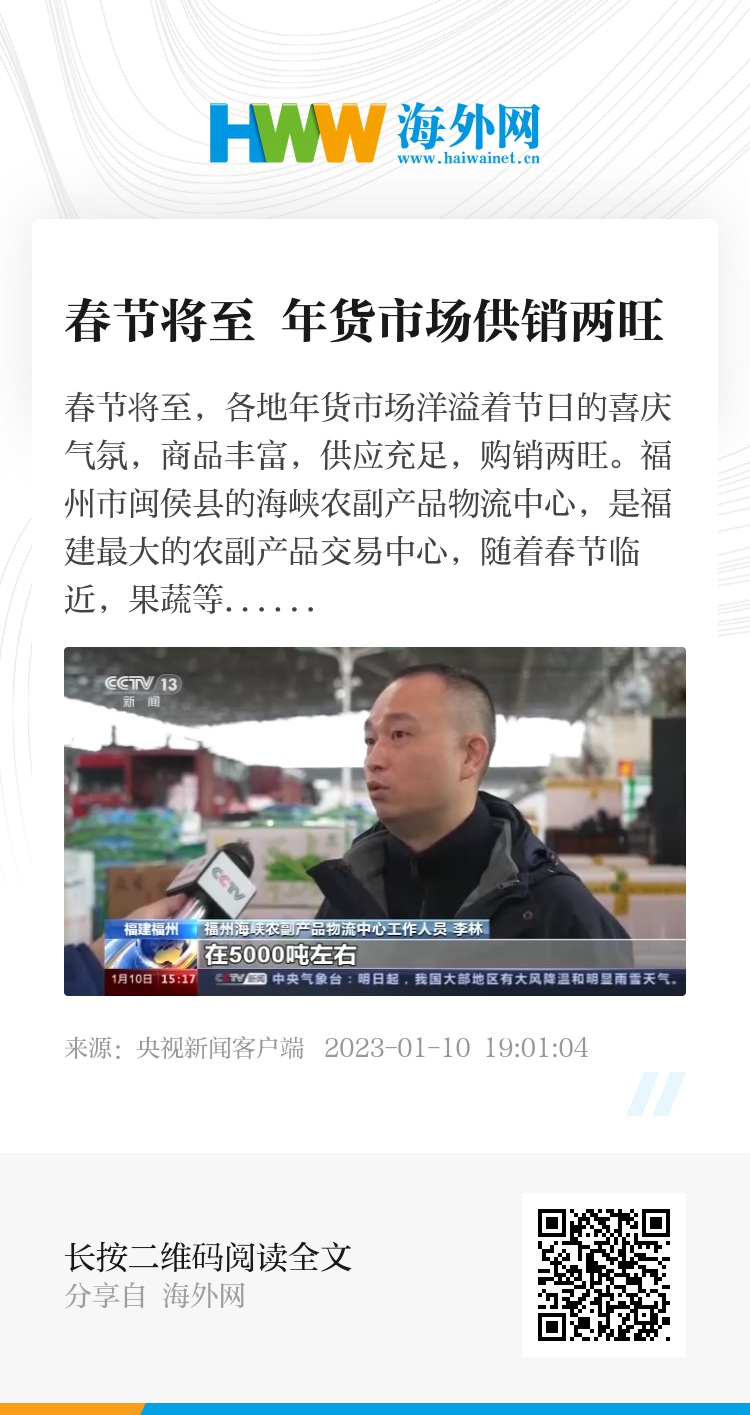 福州市闽侯县的海峡农副产品物流中心,是福建最大的农副产品交易中心,随着春节临近,果蔬等农副产品的交易量也逐日上升。蔬菜、果品、肉品、副食品及冻品五个专业批发市场货品齐全,来往的运货车辆络绎不绝。