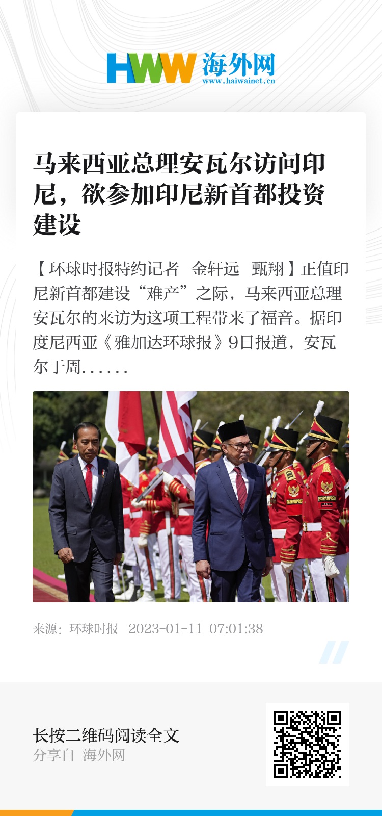 【环球时报特约记者 金轩远 甄翔】正值印尼新首都建设“难产”之际,马来西亚总理安瓦尔的来访为这项工程带来了福音。