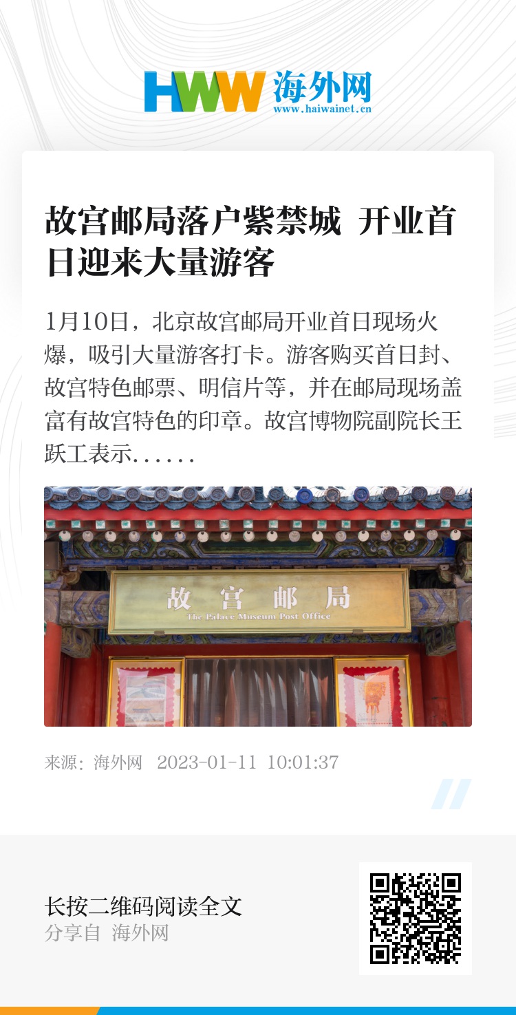 1月10日,北京故宫邮局开业首日现场火爆,吸引大量游客打卡。游客购买首日封、故宫特色邮票、明信片等,并在邮局现场盖富有故宫特色的印章。故宫博物院副院长王跃工表示,故宫邮局将为广大观众提供邮寄便利服务,将不断丰富故宫主题文创产品,凭借邮政特有的纪念意义,使故宫主题文创产品的艺术性、收藏性与纪念性兼备,为广大观众平添旅游乐趣,助力弘扬故宫承载的中华优秀传统文化。图片作者:宋宇/视觉中国