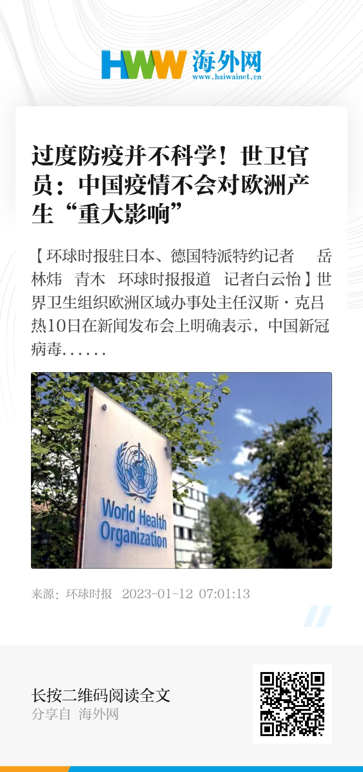 【环球时报驻日本、德国特派特约记者 岳林炜 青木 环球时报报道 记者白云怡】世界卫生组织欧洲区域办事处主任汉斯·克吕热10日在新闻发布会上明确表示,中国新冠病毒感染人数增加不会对欧洲产生“重大影响”,因为根据中国政府提供的数据,在中国传播的两种变异毒株已经在欧洲国家出现。11日,瑞士宣布,不会对中国游客采取强制新冠病毒检测措施。而少数执意针对中国采取歧视性入境限制措施的国家,正在担心中国对等措施的影响。