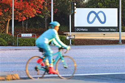近日,在美国加利福尼亚州门洛帕克的Meta公司总部,一名骑行者经过该公司标志。新华社/路透