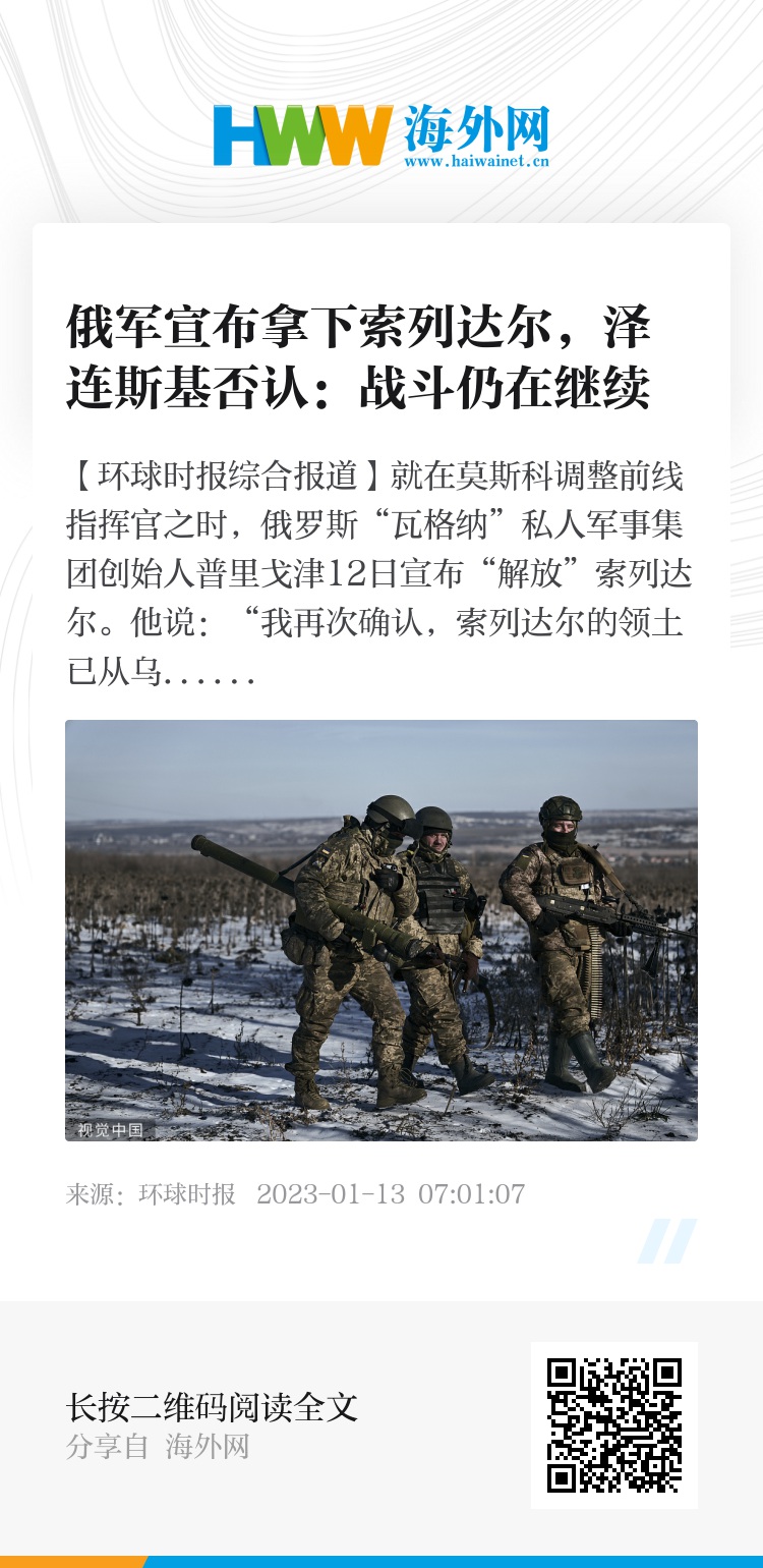 【环球时报综合报道】就在莫斯科调整前线指挥官之时,俄罗斯“瓦格纳”私人军事集团创始人普里戈津12日宣布“解放”索列达尔。他说:“我再次确认,索列达尔的领土已从乌军手中完全解放,并被清扫干净。平民已从该市撤出。俄军已消灭了500名不愿投降的乌克兰军人。”