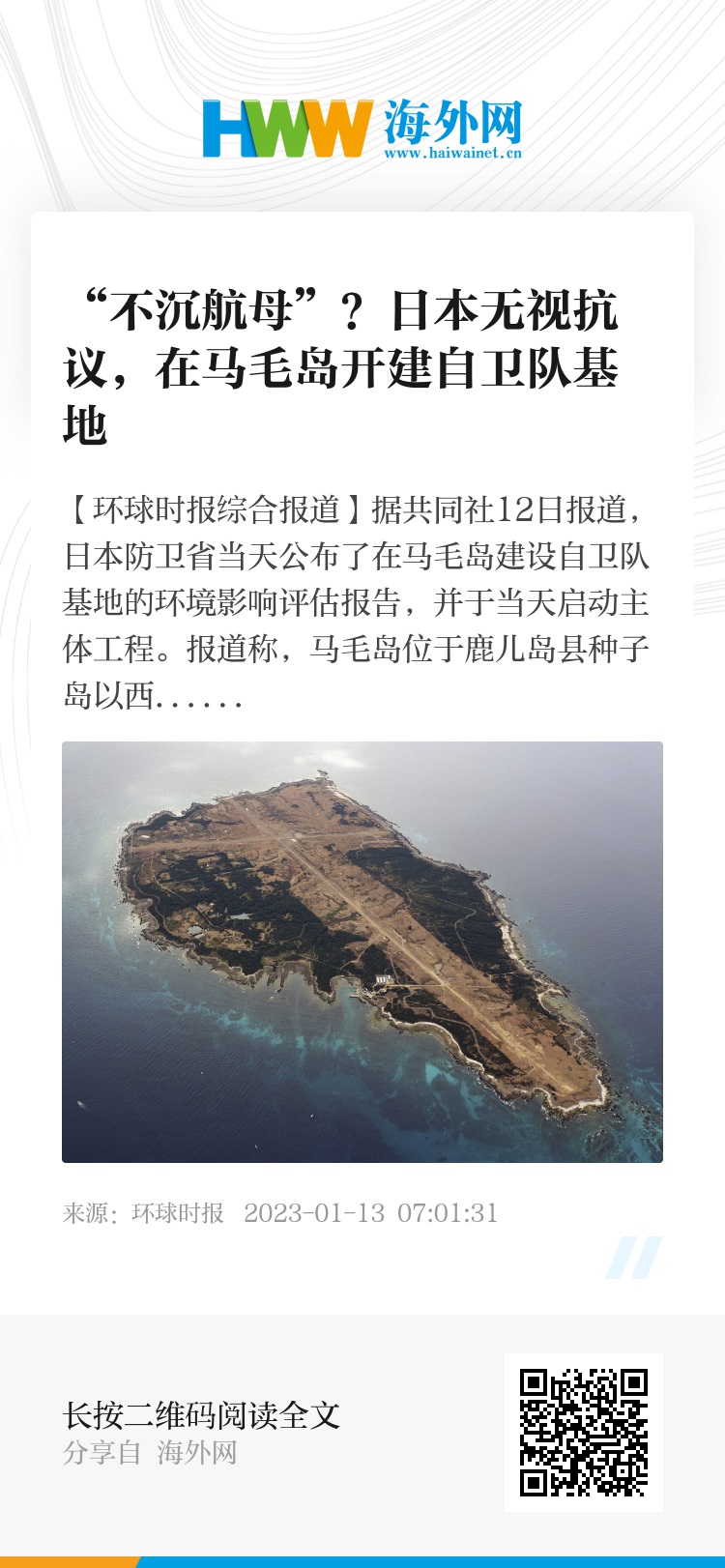 报道称,马毛岛位于鹿儿岛县种子岛以西约12公里,总面积为8平方公里,是日本第二大无人岛。由于驻日美军舰载机训练使用的厚木基地和岩国基地面积狭小、噪音扰民,美日协商在马毛岛修建自卫队基地,并将美军航母舰载机陆上起降训练设施搬迁至此,并写入2011年日美安保磋商委员会(2+2)联合文件中。为此,日本政府还不惜斥资160亿日元(约合1.47亿美元)从私人公司手里购得该岛。