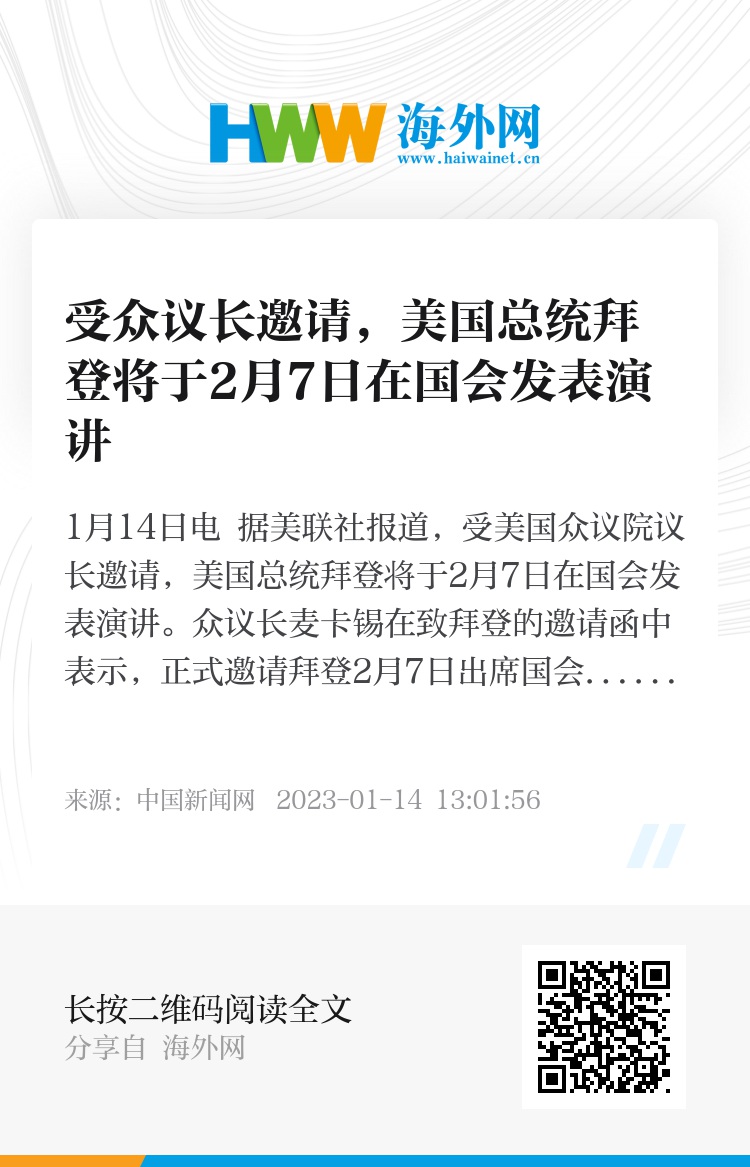 中新网1月14日电 据美联社报道,受美国众议院议长邀请,美国总统拜登将于2月7日在国会发表演讲。