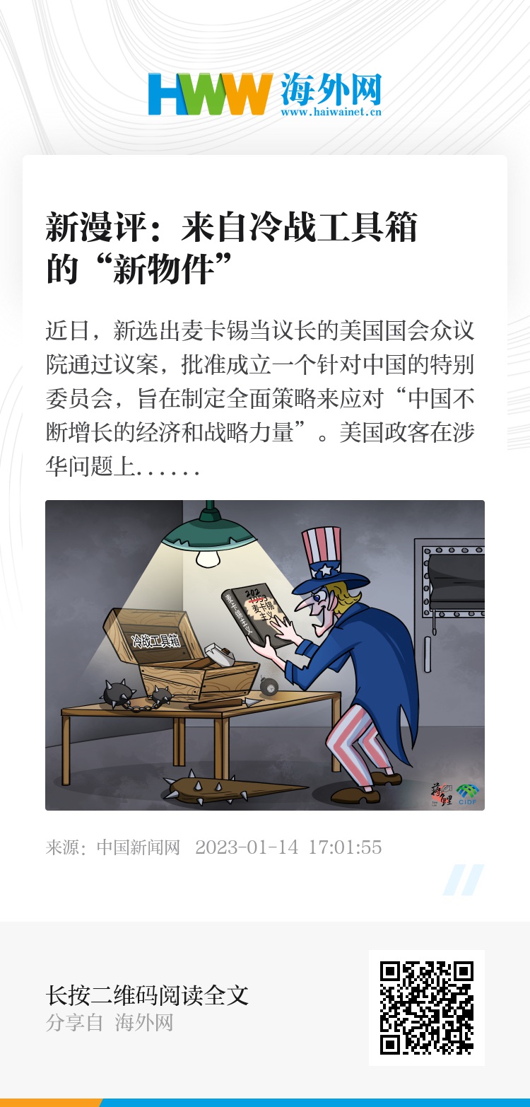 近日,新选出麦卡锡当议长的美国国会众议院通过议案,批准成立一个针对中国的特别委员会,旨在制定全面策略来应对“中国不断增长的经济和战略力量”。