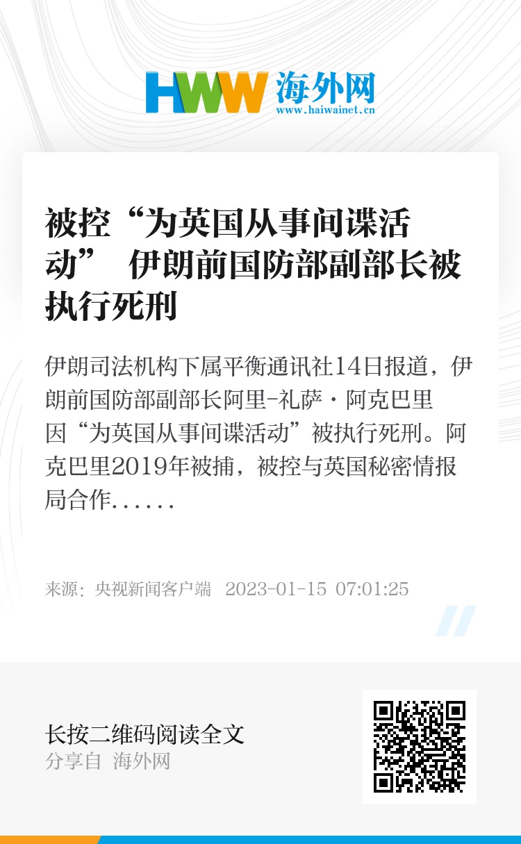 伊朗司法机构下属平衡通讯社14日报道,伊朗前国防部副部长阿里-礼萨·阿克巴里因“为英国从事间谍活动”被执行死刑。