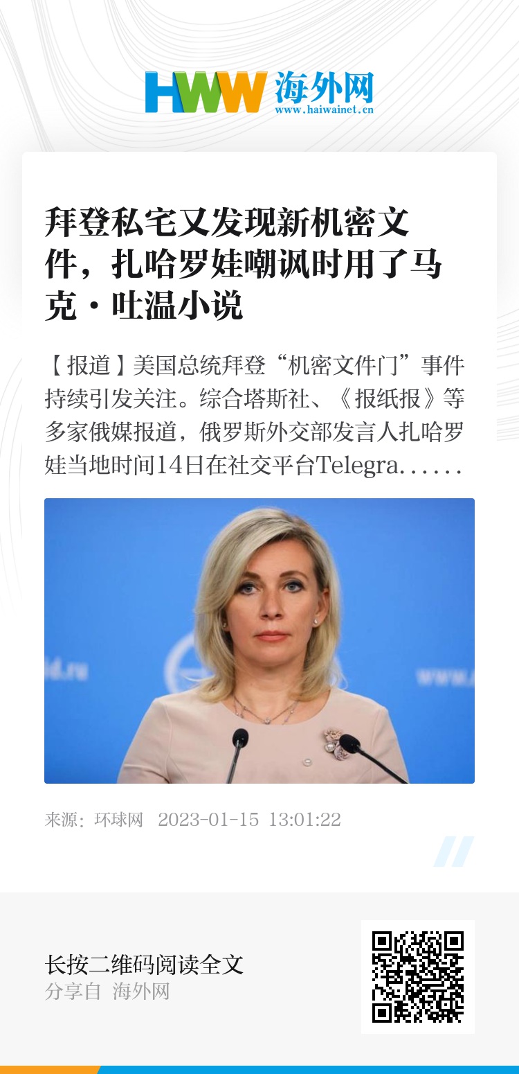 此前一天,扎哈罗娃13日也曾在Telegram上发文,嘲讽拜登私宅的车库存放机密文件。她在发文中写道,“拜登的车库里找到了机密文件,还没人就此指责我们呢吧?”对此,俄罗斯联邦新闻社解读称,扎哈罗娃认为美方已经习惯在各个问题上指责俄罗斯,她对美方这次未指责俄方感到“惊讶”。