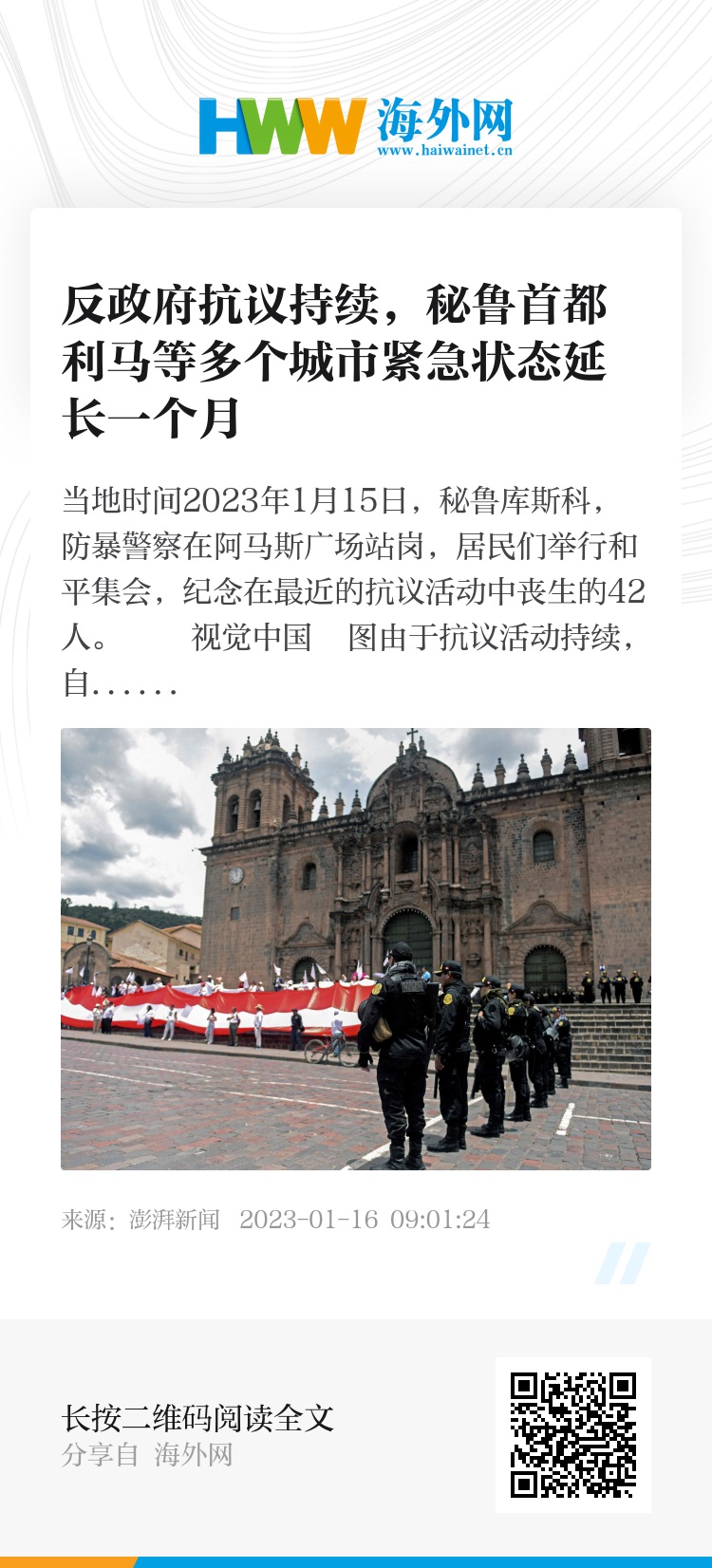 由于抗议活动持续,自当地时间15日起,秘鲁首都利马等多个城市的紧急状态将延长一个月。