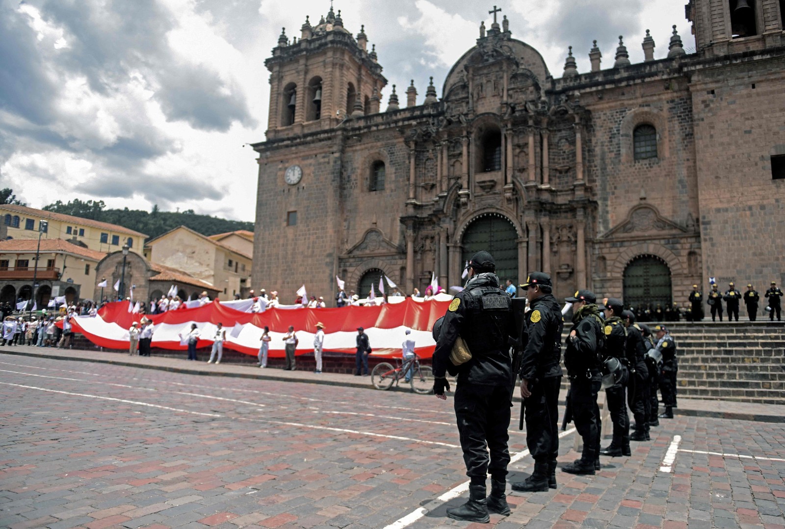 当地时间2023年1月15日,秘鲁库斯科,防暴警察在阿马斯广场站岗,居民们举行和平集会,纪念在最近的抗议活动中丧生的42人。 视觉中国 图