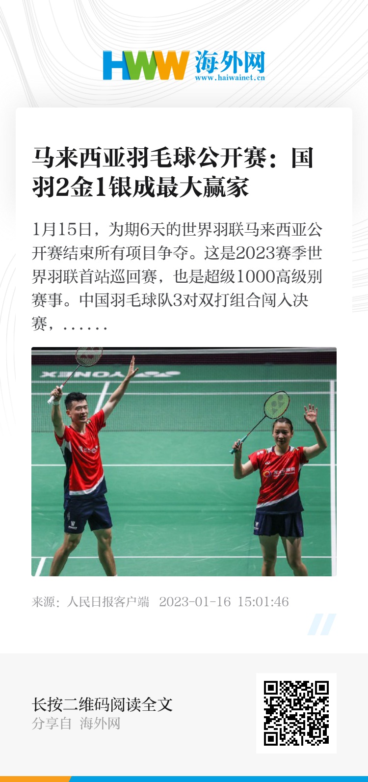 1月15日,为期6天的世界羽联马来西亚公开赛结束所有项目争夺。这是2023赛季世界羽联首站巡回赛,也是超级1000高级别赛事。中国羽毛球队3对双打组合闯入决赛,最终混双郑思维/黄雅琼、女双陈清晨/贾一凡夺得冠军,男双梁伟铿/王昶获得亚军。
