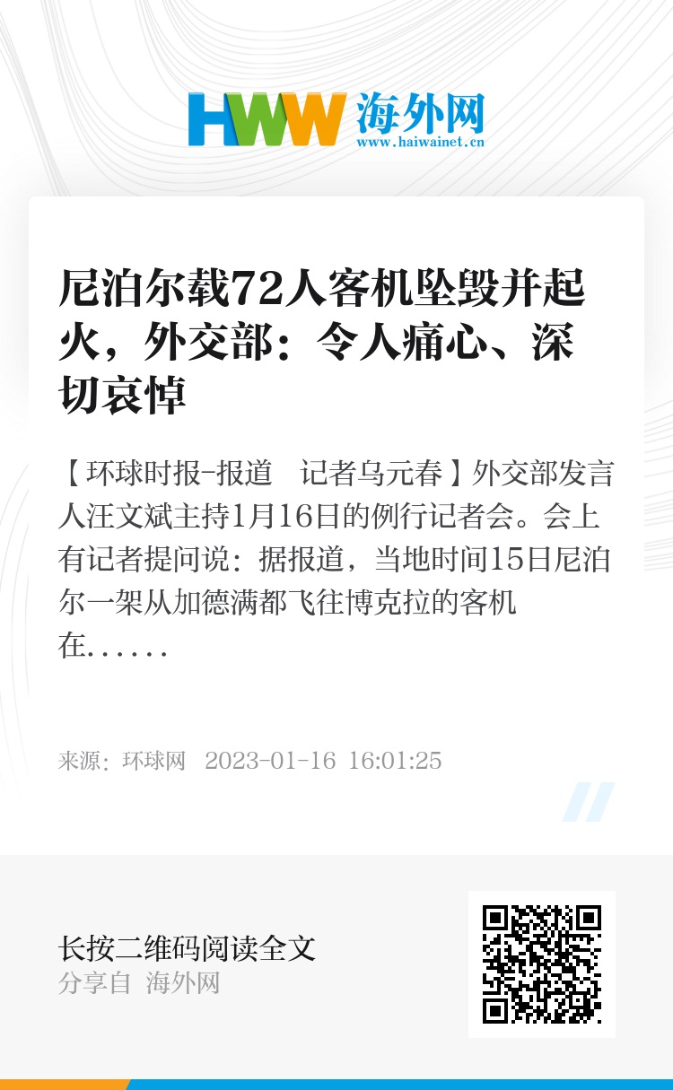 【环球时报-环球网报道 记者乌元春】外交部发言人汪文斌主持1月16日的例行记者会。会上有记者提问说:据报道,当地时间15日尼泊尔一架从加德满都飞往博克拉的客机在博克拉坠毁并起火,机上载有68名乘客和4名机组人员。截至目前,尚未确认有人生还。中方有无向尼方表达慰问计划?