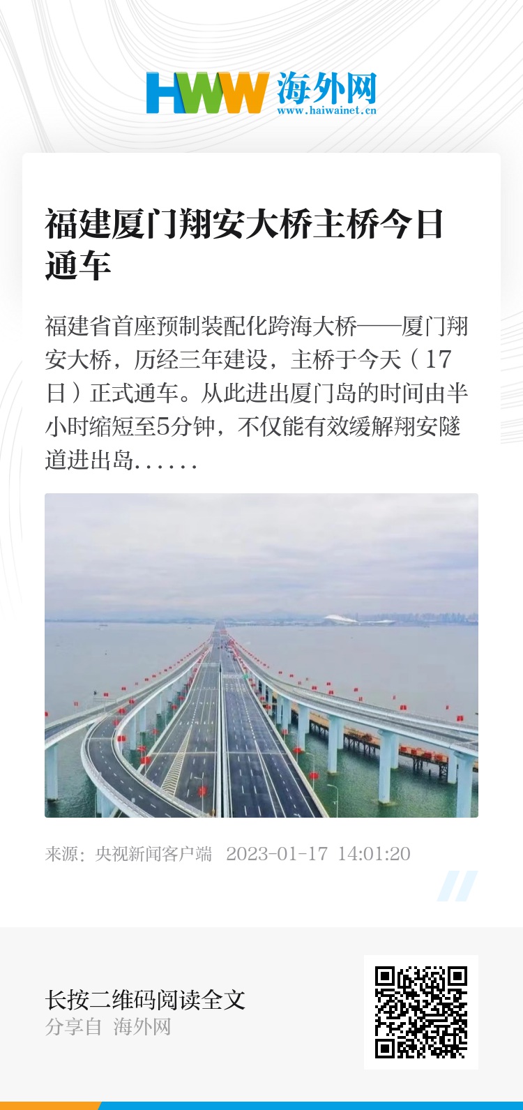 福建省首座预制装配化跨海大桥——厦门翔安大桥,历经三年建设,主桥于今天(17日)正式通车。从此进出厦门岛的时间由半小时缩短至5分钟,不仅能有效缓解翔安隧道进出岛交通压力,更是进一步完善厦门市“两环八射”快速路网的重大举措。